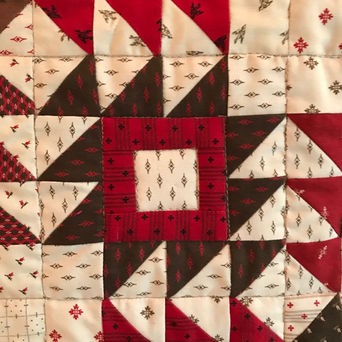The center of this quilt was quilted by my regular quilter, Cathy of CJ Designs. She left the basting in the borders and then turned it over to me to finish up those scalloped edges. Since the pattern is by Sherri McConnell of A Quilting Life, I knew she’d have good ideas of how to finish the quilt, so I pretty much mimicked what her quilter did. More information about the pattern can be found on *this post.*