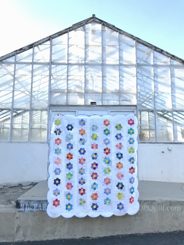 I’d originally thought about the Botannic Gardens, with all their lush greenery and wooden benches; I’ve snapped photos in this place before, and Field Flowers, with its scalloped edges is so old-fashioned looking I wanted to head there. It was closed. As we walking back to the car to leave, I spotted this old greenhouse. UCR is noted for its agricultural emphasis, as we breed a lot of the oranges you are eating now (Cuties, anyone?). This greenhouse seemed the perfect place, for my husband, with three broken ribs, to be able to hold up the quilt. (By the way, he has a Qh.D: a doctorate in Quilt Holding.)