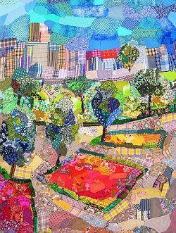“Edrica Huws, born in 1907, spent two years at the Chelsea School of Art, gained a diploma from the Royal College of Art, and worked as an artist until she married the Welsh sculptor Richard Huws in 1931. Five children later, and living in rural Anglesey with neither electricity nor running water, she turned her hand to poetry and began collecting fabrics for her patchwork. She was 51 when she began her first patchwork picture of a greenhouse. It took her a year. The challenge was in getting the assemblage of differently figured pieces to look like a representation of her subject, but not too like it. The scraps had to be treated like scraps, not like paint, or mosaic. Edrica said herself in a lecture in 1982 that to her ‘the essence of an aesthetic experience’ was ‘the control just winning’.”