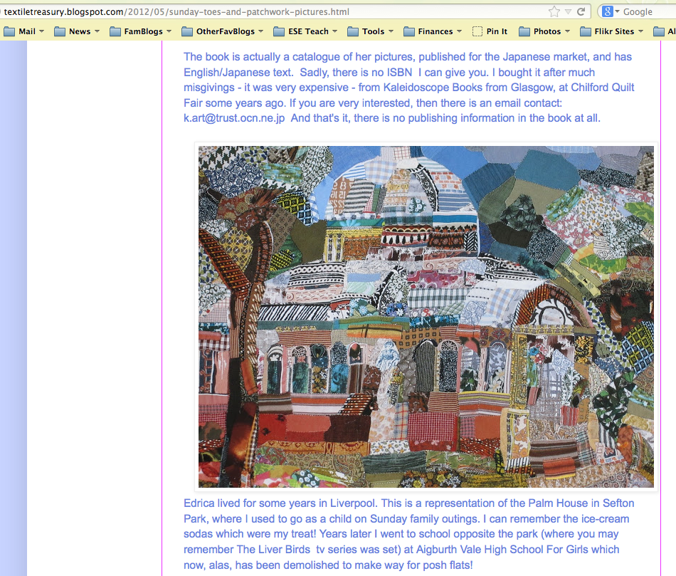 That’s where I found out about this (now-deceased) quilt artist Edrica Huws. (Address of the blog is in the picture.) Apparently nearly 51 years old when she began her mosaic-like patchworks, she sometimes took a year to create just one. Here is an excerpt from an article in the Guardian newspaper: