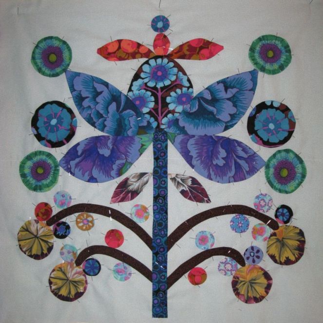 But I did mess with this one. The brightly colored circles with red in them are a different line of fabric, Amy Butler, and they stand out among Kaffe’s florals. (Although I am using some Phillip Jacobs, and others from the Westminster line.)
