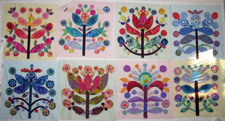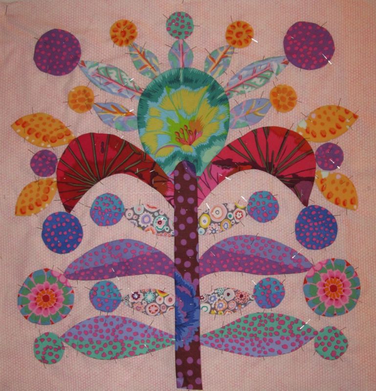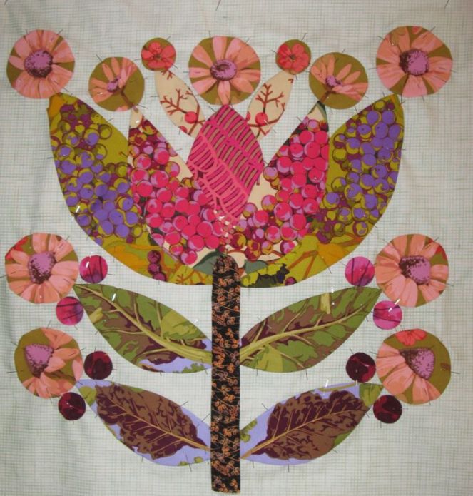 I can see, though, that working in a series has improved my ability to see what works, as I change out the leaves and some other smaller pieces, as well (above). I found that I was less enamored of one of the earlier blocks, but it was already appliqued down and I would have been crazy to mess with it.