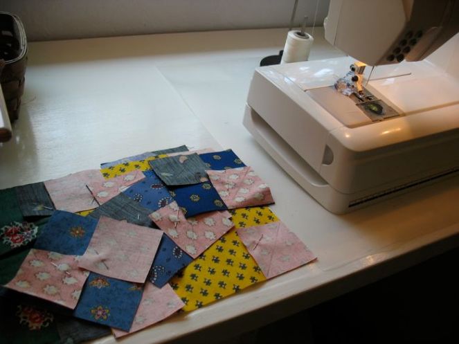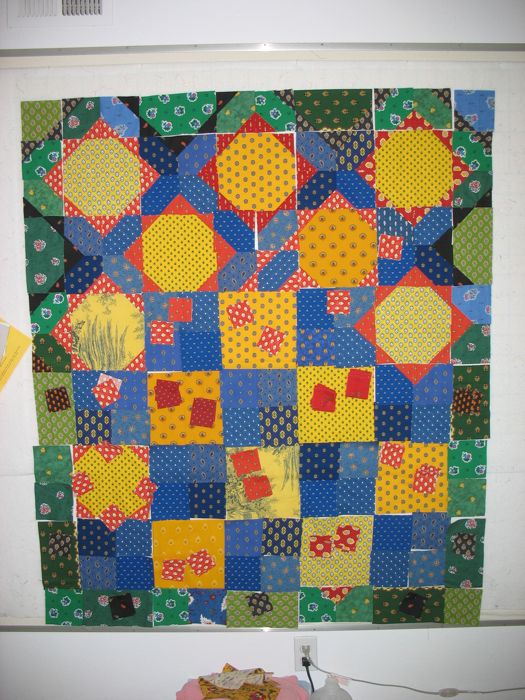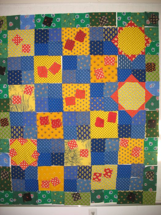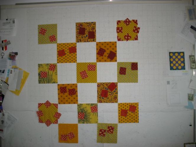 I cut out a bunch of golden yellow squares, and had to piece one of them back together from the previous quilt. Red squares distributed–thanks to the gift of fabric from my friend Tracy, I had just the right kind and color.