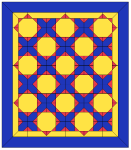 So I monkey around with ideas from the photos, ideas from my files and come up with this one, which is basically the first photo’s design turned on its side. If I focus in on the yellow blocks surrounded by the red “petals,” then it also reminds me of the fields of sunflowers we saw as we traveled in the south of France.