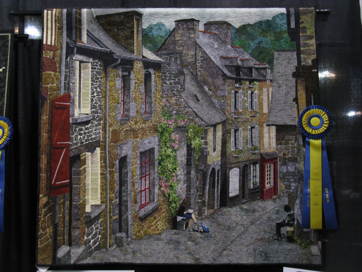 Lenore Crawford came upon an art class of teenagers sketching in the streets while on a trip to northern France, then returned home to create her quilt Capturing Brittany from what she saw. She used raw edge fused appliqué, and quilted it herself. This was another quilt that we were prevented from seeing up close, due to the barriers. I just wanted to stand there all day, enjoying her scene and her skills at bringing this to us. Click on this quilt on the Road website to see it larger.