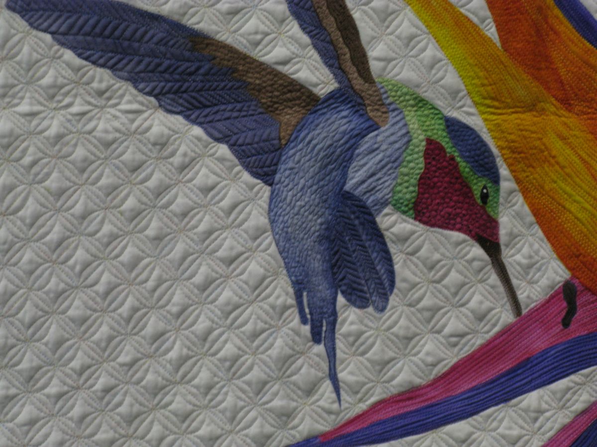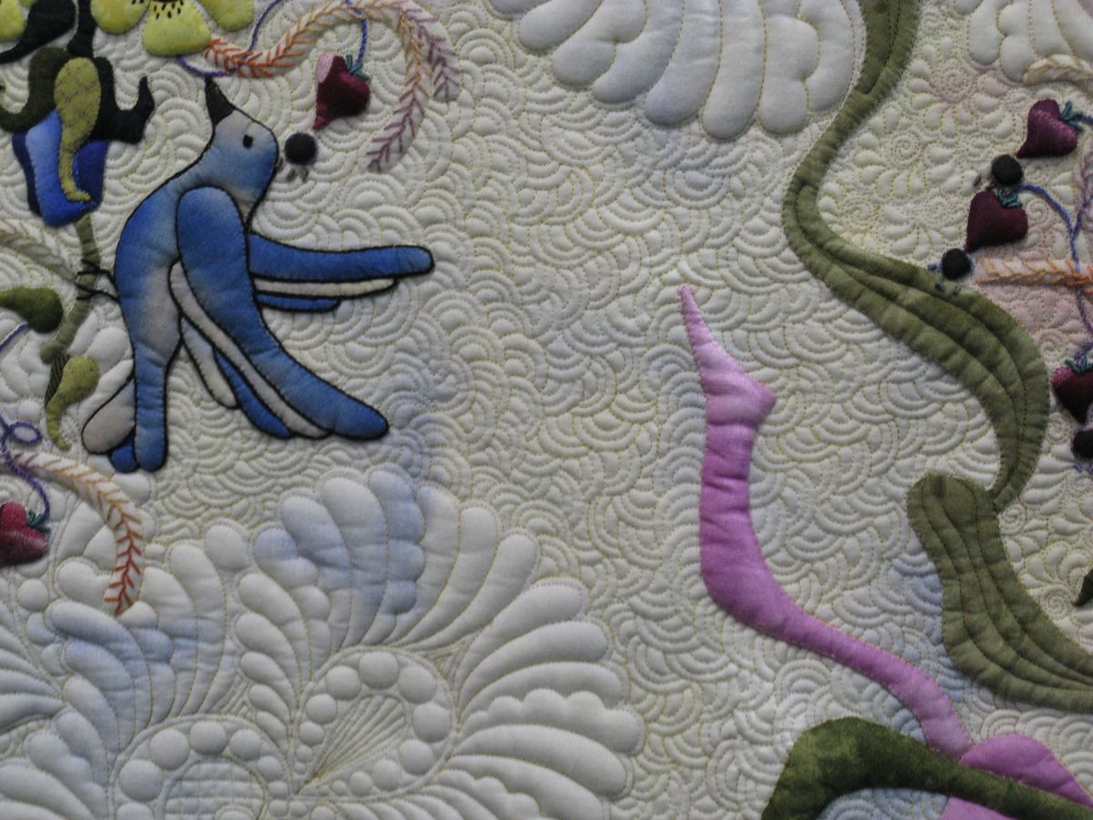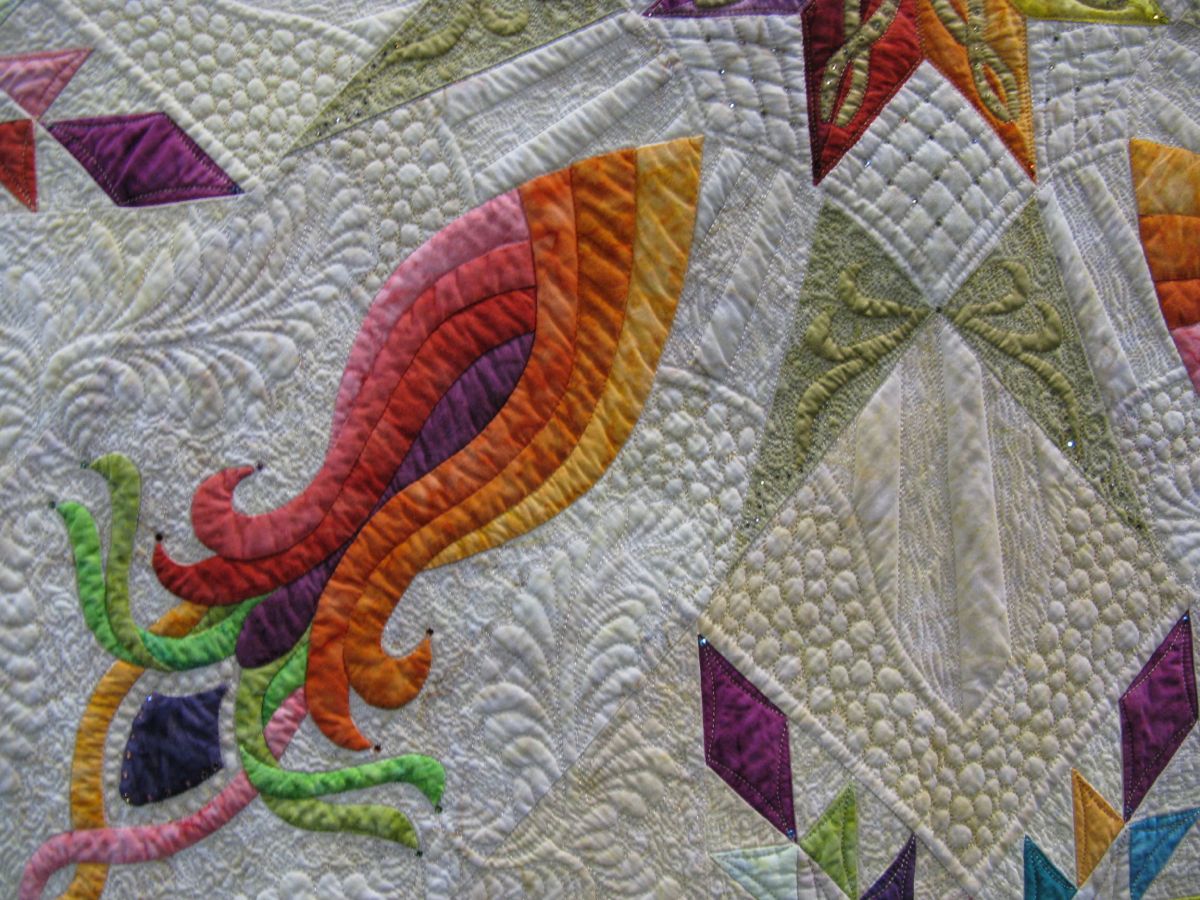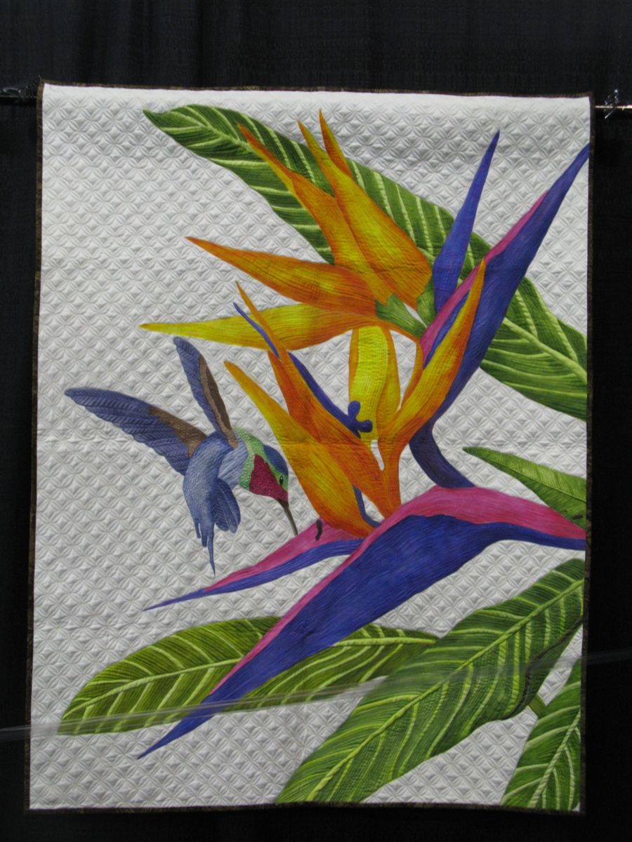 Debra Crine’s been busy. This is another quilt of hers, titled A Taste of Paradise. Taken from an illustration, she hand painted the fabric with acrylic paints and a used a variety of threads for the thread painting. She also quilted it, but no word on whether it was a DSM or a longarm.