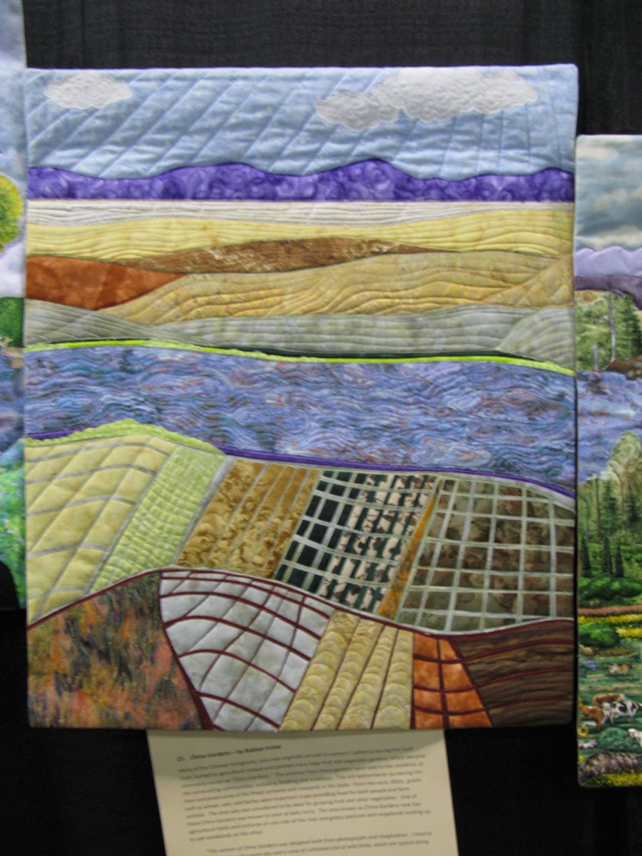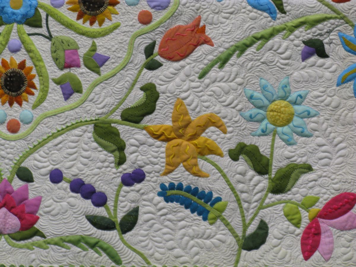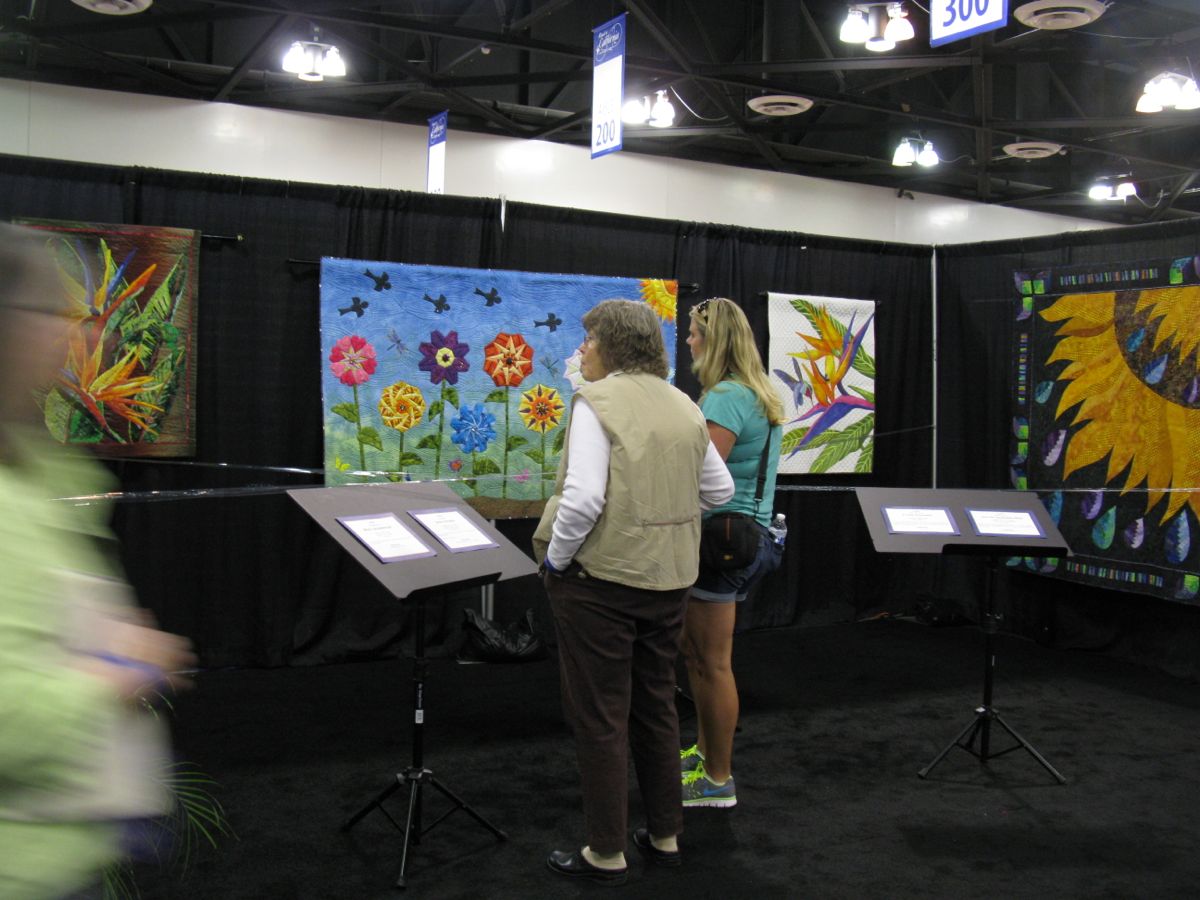 One of the odd (and maddening) things about the way they hang their quilts at Road, is this unfortunate habit of grouping all like things together (p.s. have they ever heard of “habituation?”). The downside is that a viewer’s eyes begin to glaze over. . .oh, another flower. . . oh, another animal. . . oh, another whatever. . . after seeing 10 of the same subject in a row. The upside is that you can always find them again if you want to find them again “It’s in the flower section,” like we are at a garden show and all the lilies are grouped together or all the orchids. It’s been this way for quite a few years, and nothing I ever say will change that–it’s just one of Road’s idiosyncrasies. But since I’m trying to bring you the essence of Road, that’s just part of it.
