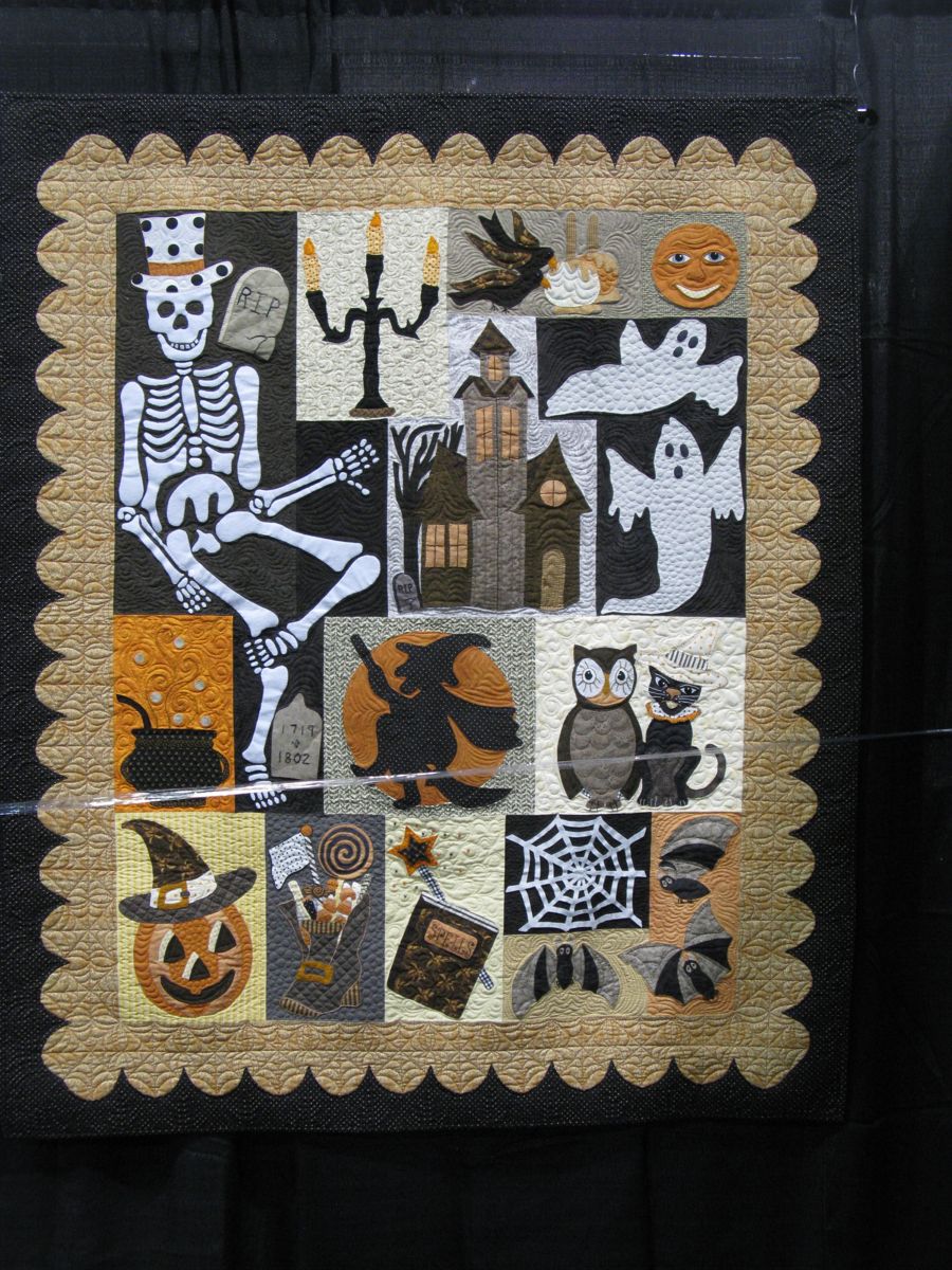 Always fun to have a Halloween Quilt! Debra Elenbaas pieced the top and Diane Beauchamp quilted Happy Hauntings. It’s taken from a pattern by Verna Mosquera of The Vintage Spool, and has lots of appliqué.