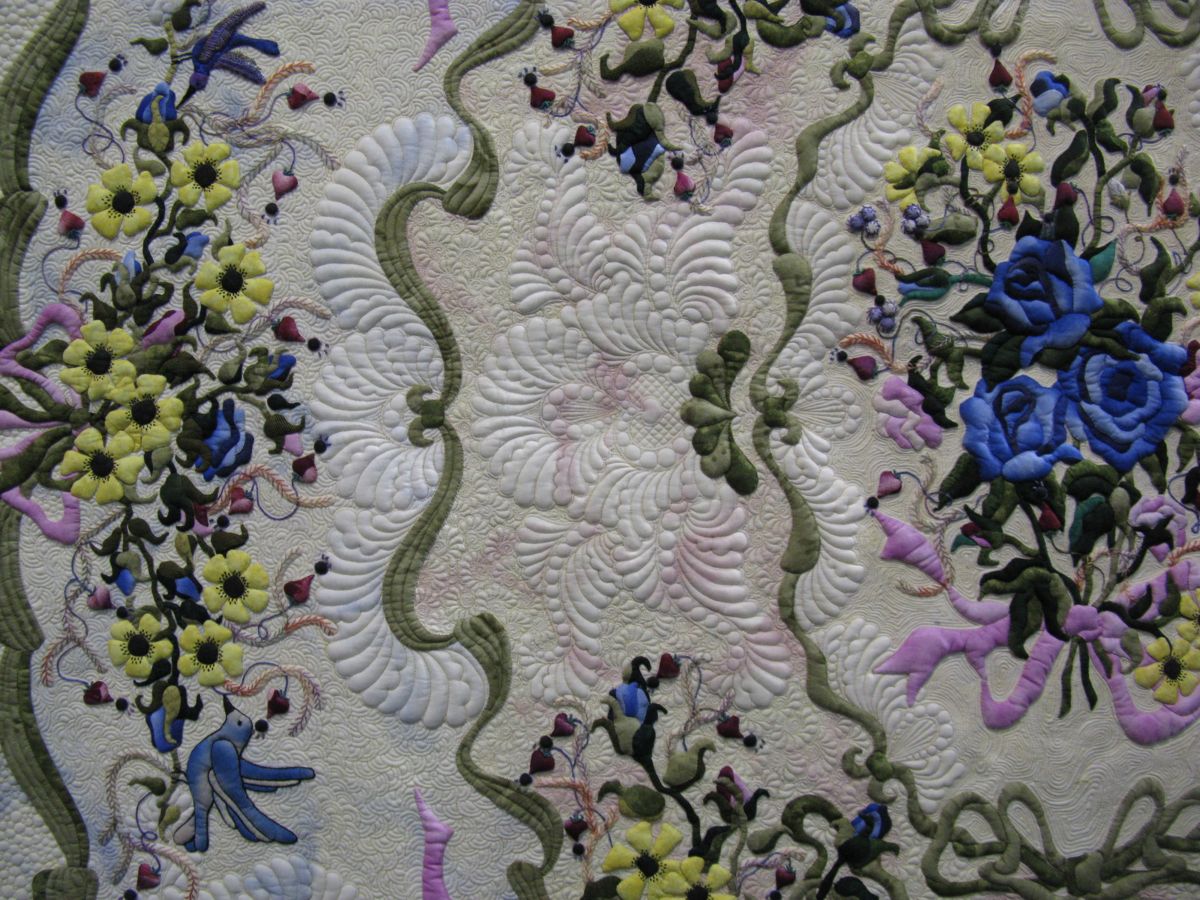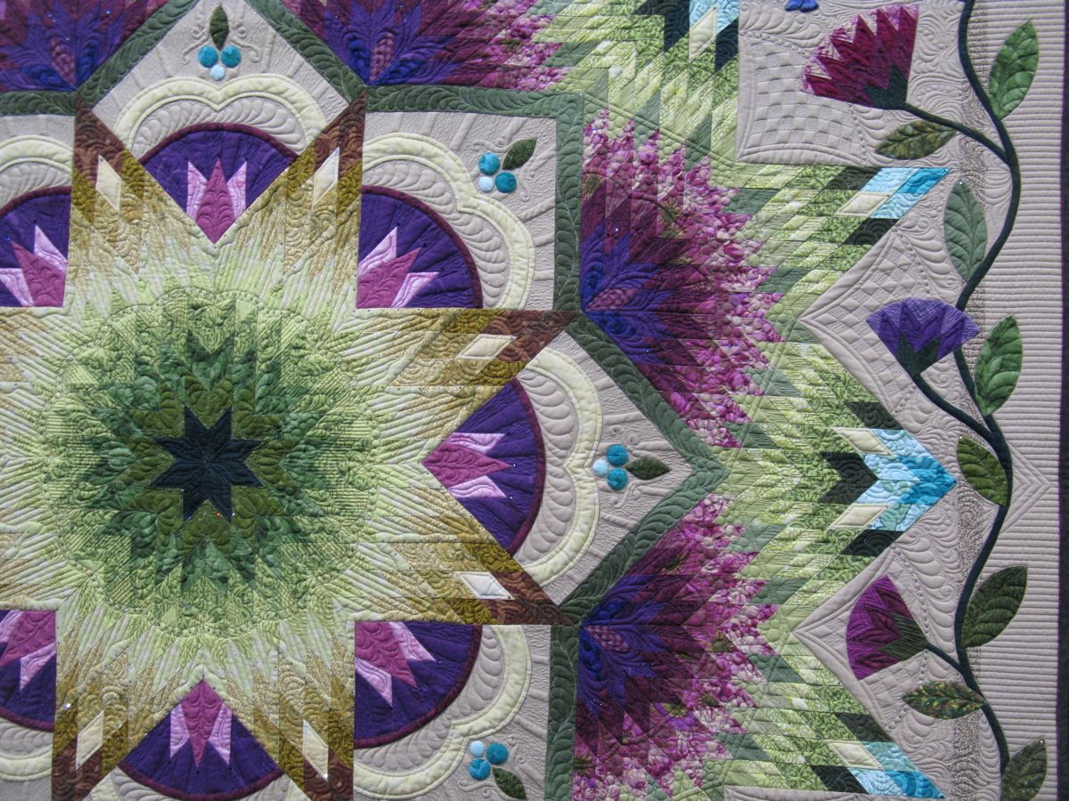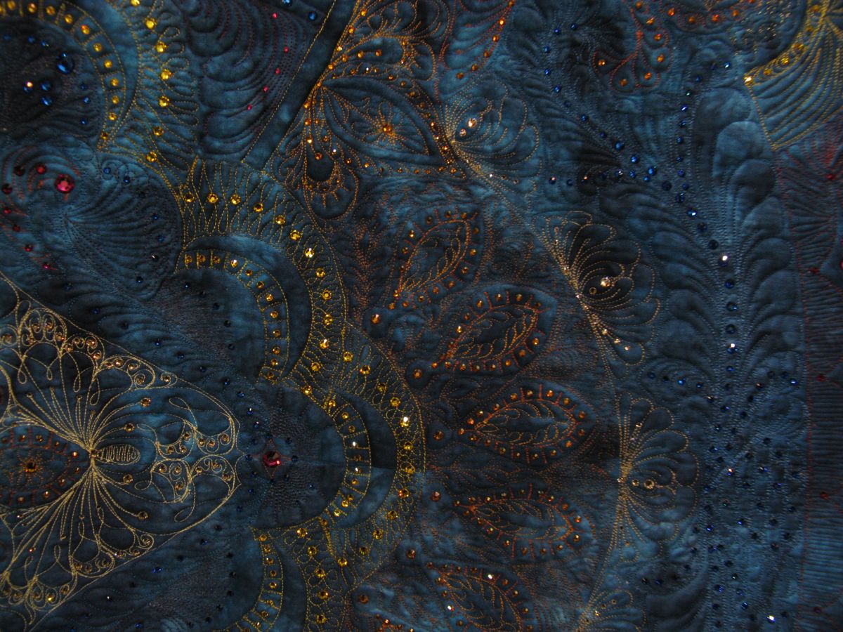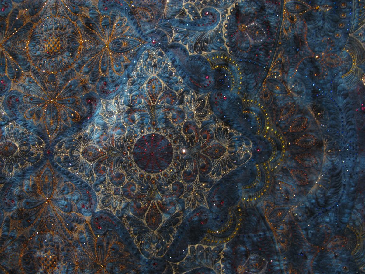 This is a quilt that gets a thumbs up on the use of crystals (generally, I think it is WAY overdone in show quilts), as they were used to be a integral part of the design and only for accent. But using French knots would have been okay with me too, in those spaces where she put some bling.