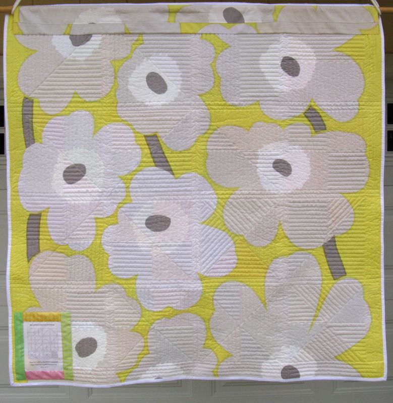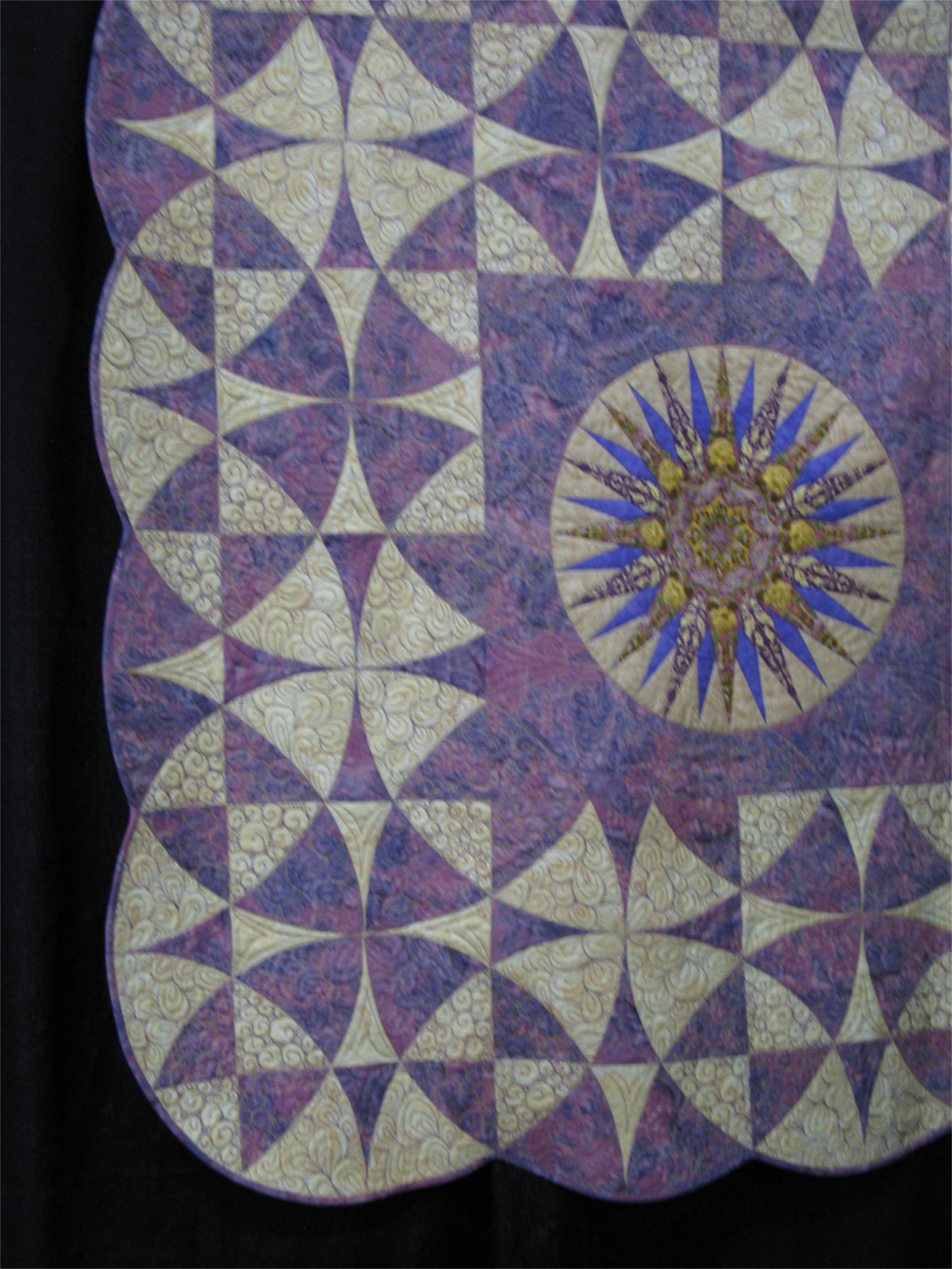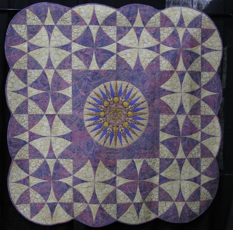 Zen Garden was made and quilted by Margaret Solomon Gunn, and is based on the “Blooming Carpenter’s Star.” She noted that all the fabrics she used were from her stash (certainly noteworthy!) and she used a longarm machine to complete the quilting.