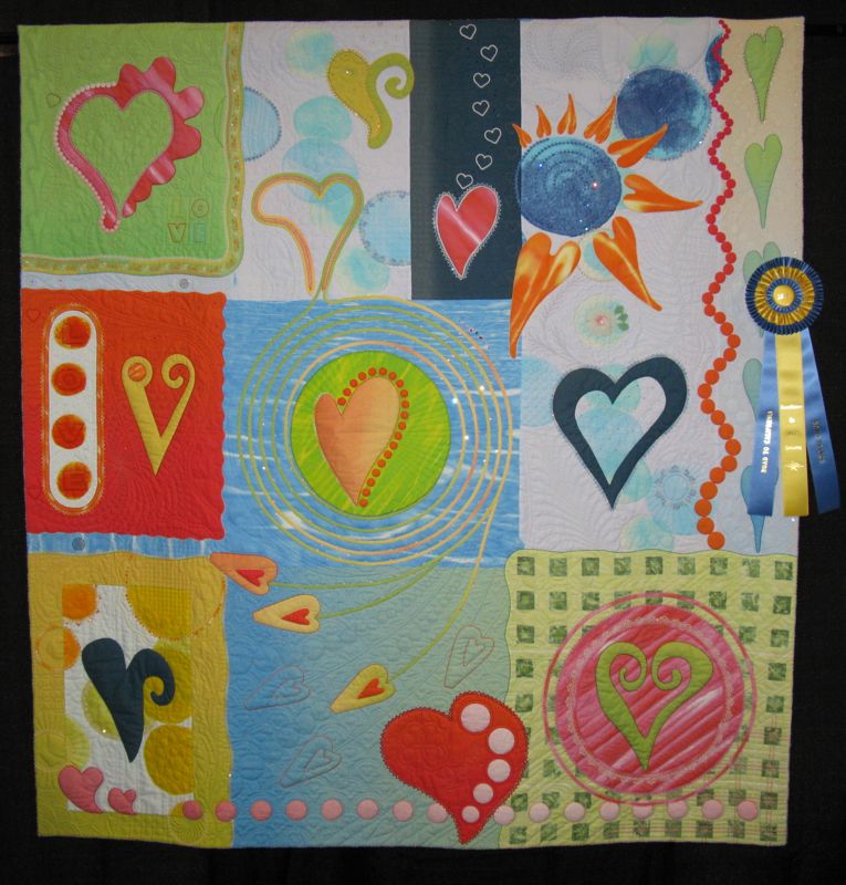 Cheryl See’s quilt, Tatted Hearts had 20 yards of her great-grandmother’s hand-tatted lace and a doily. Never could locate the doily, so I assume it was used in the construction of this whimsical quilt, but the yards of tatting are evident.