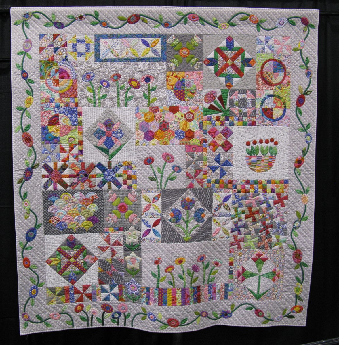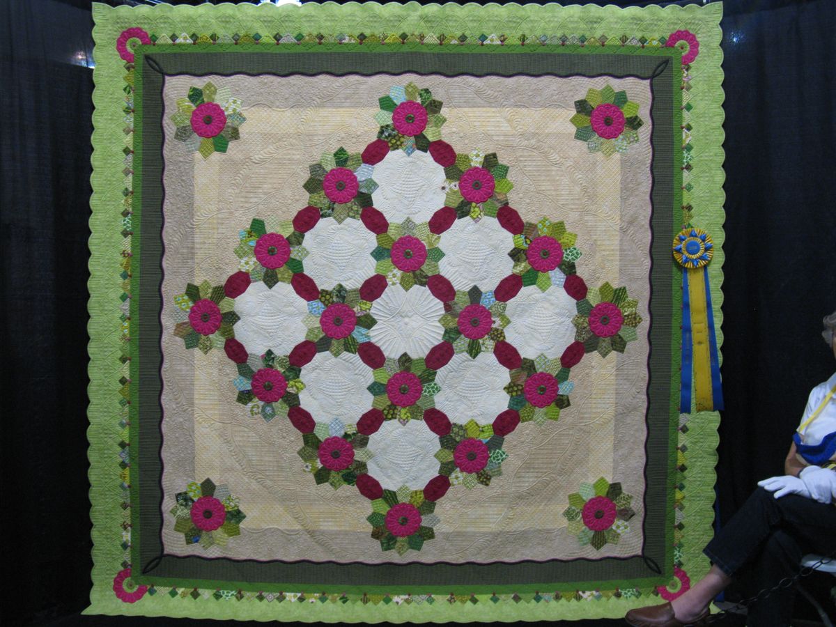 This traditional Dresden Plate design is updated in a pink and green setting with central blocks to allow for fabulous quilting. Quilting designs are “hand-guided.” Margaret Solomon Gunn titled this Big Bertha, and it was a stand out quilt, as you can tell by that fancy ribbon hanging on the side.