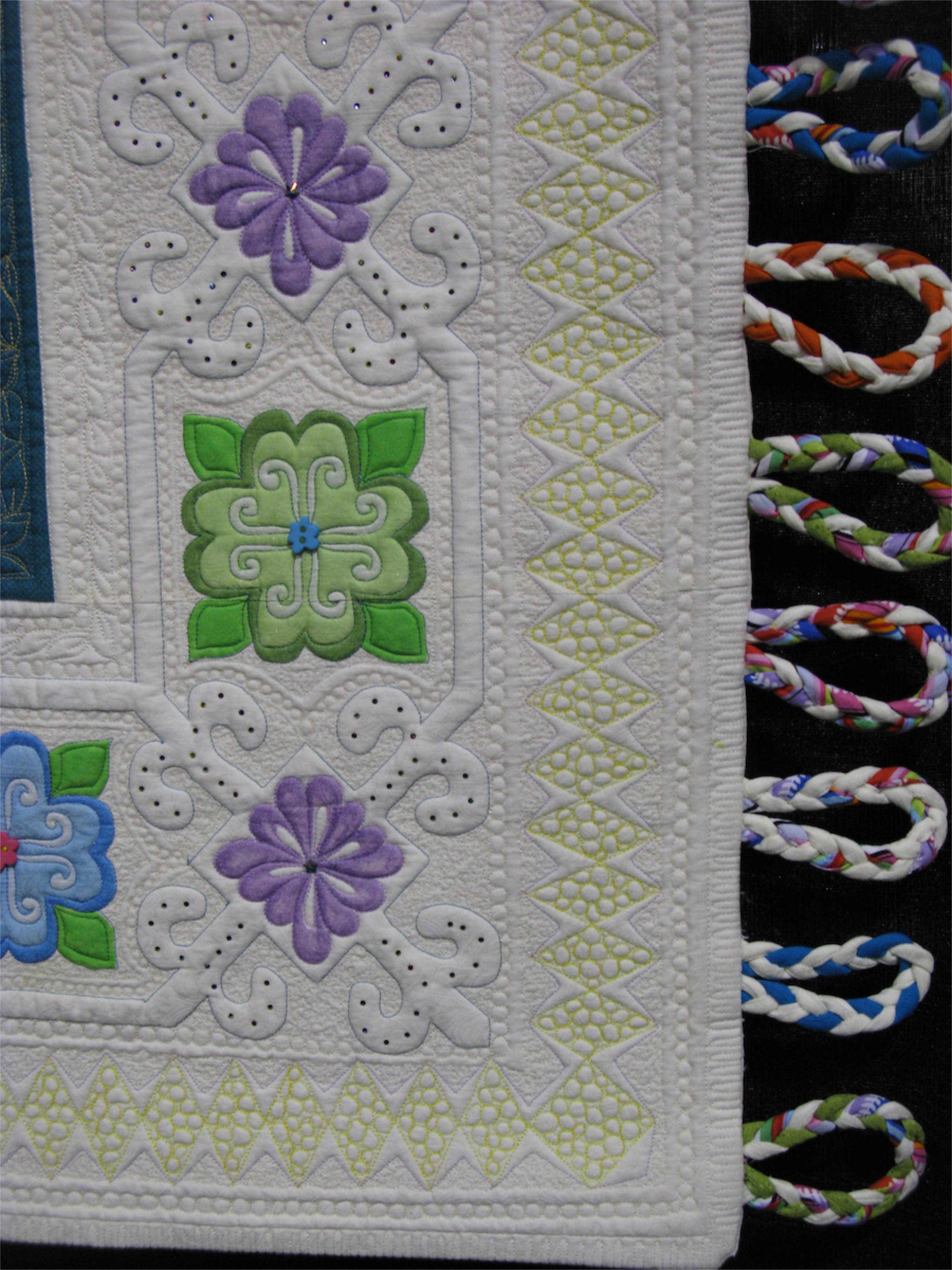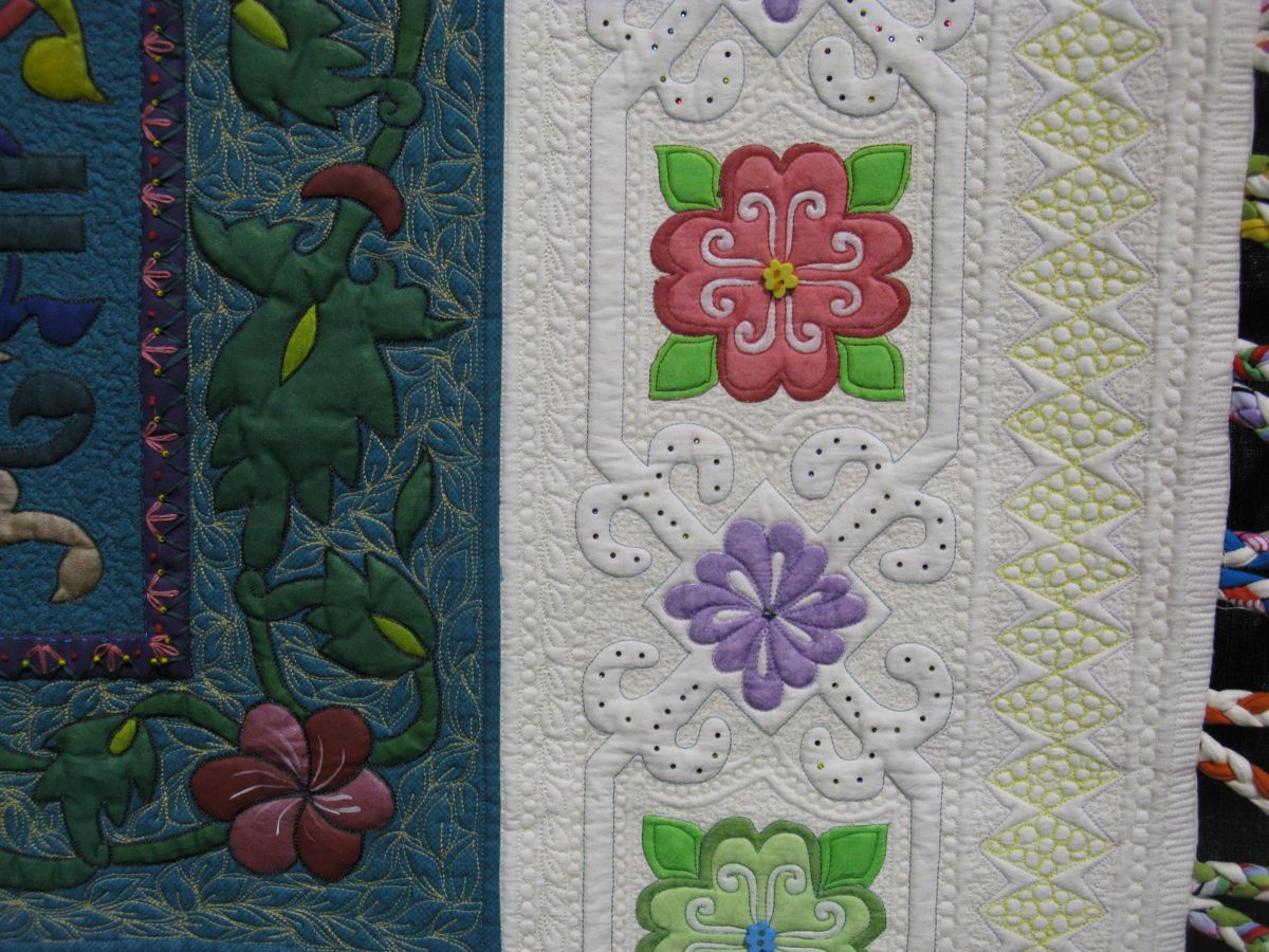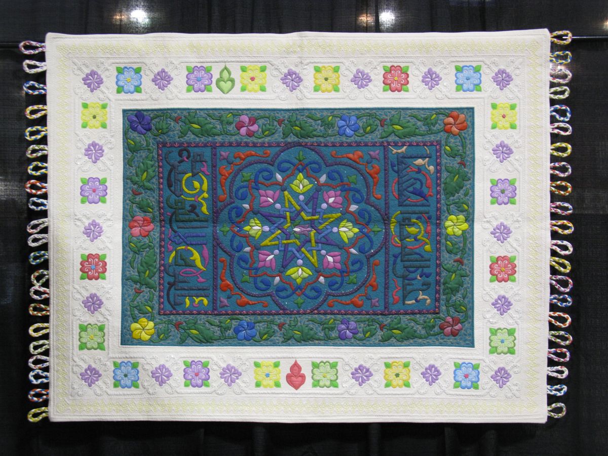 Magic Carpet Ride reflects the childhood of maker Janet Wilson, when she noted that she grew up with Turkish carpets all over their floors. She set out to create a design that was a colorful quilted, version of these carpets.