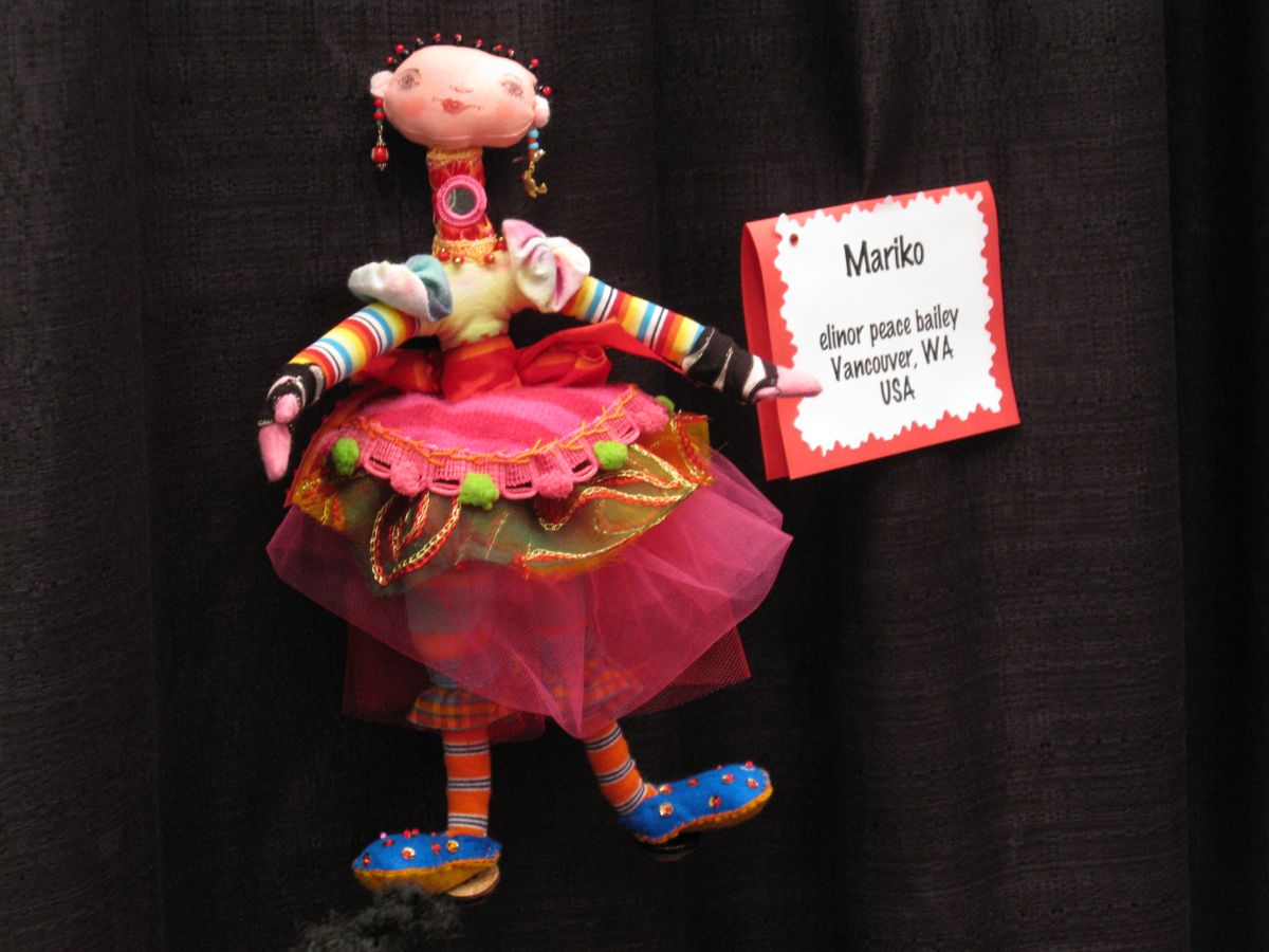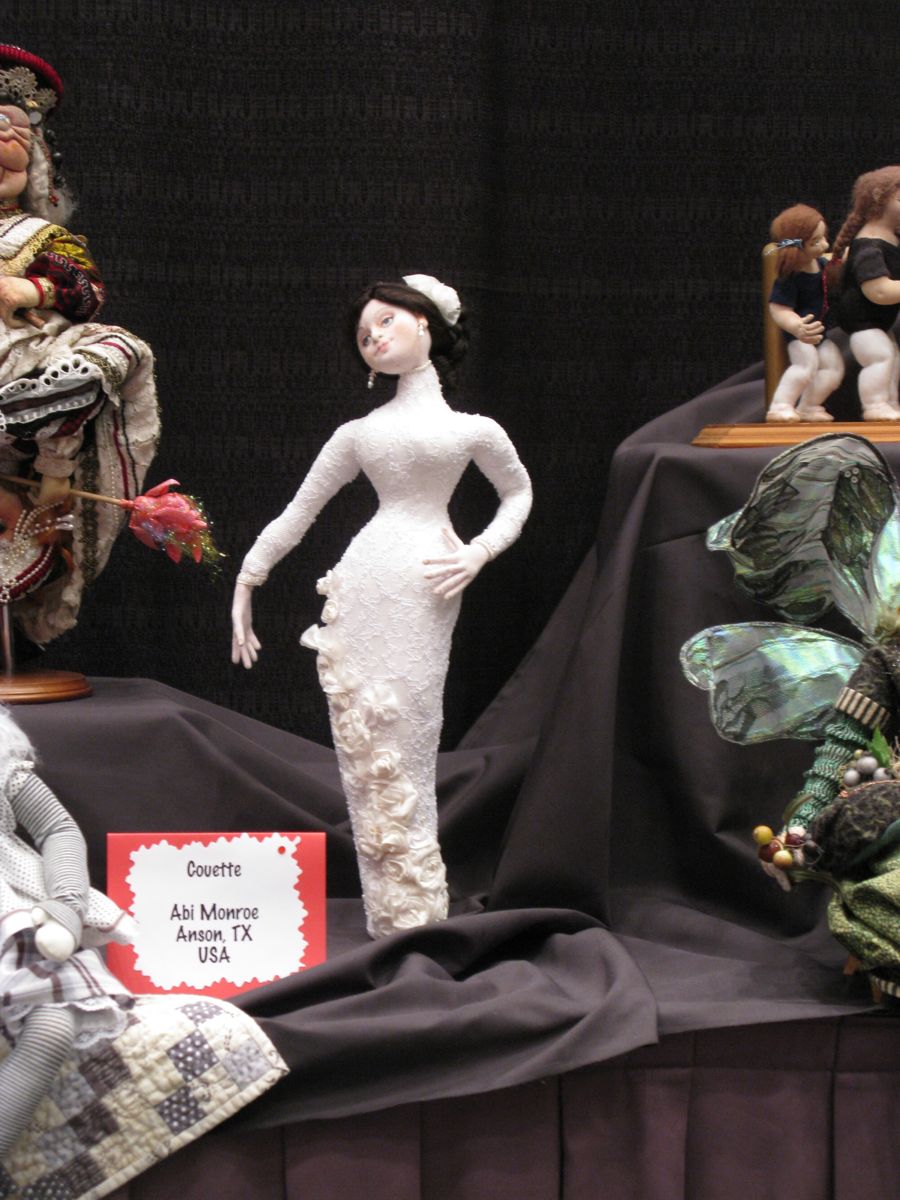 I’m guessing that the economies of sponsorship outweigh the showing of quilt-show quilts, but am saddened by the shrinking number of quilts, and wish, somehow, we could have more individual quilts, fewer galleries of quilts. The category of wearable art seems to have disappeared this year, and the doll exhibit was substantially reduced. Here’s a couple: