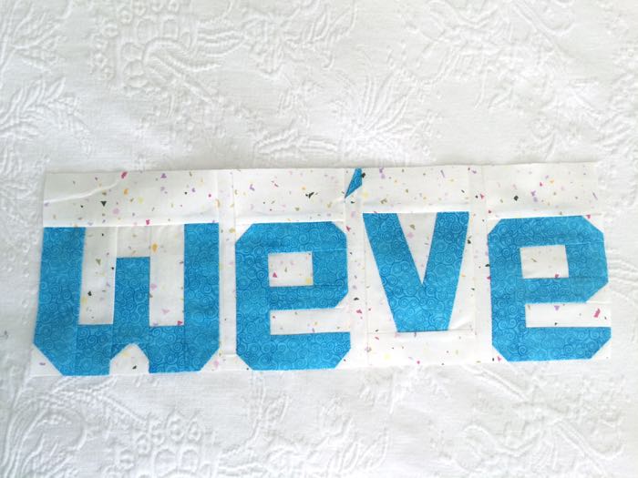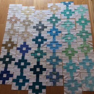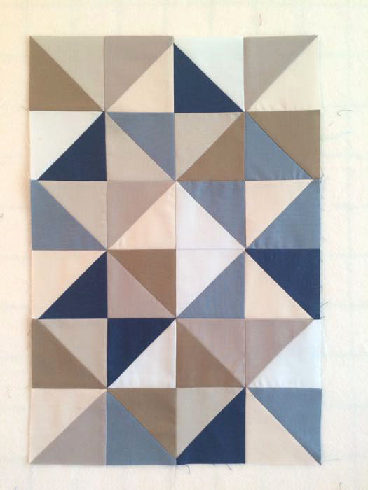 Mary, for August, found a quilt she liked on the Robert Kaufman website, called Woven Pattern, and wanted us to make blocks in the color of the beach: sea and sand.