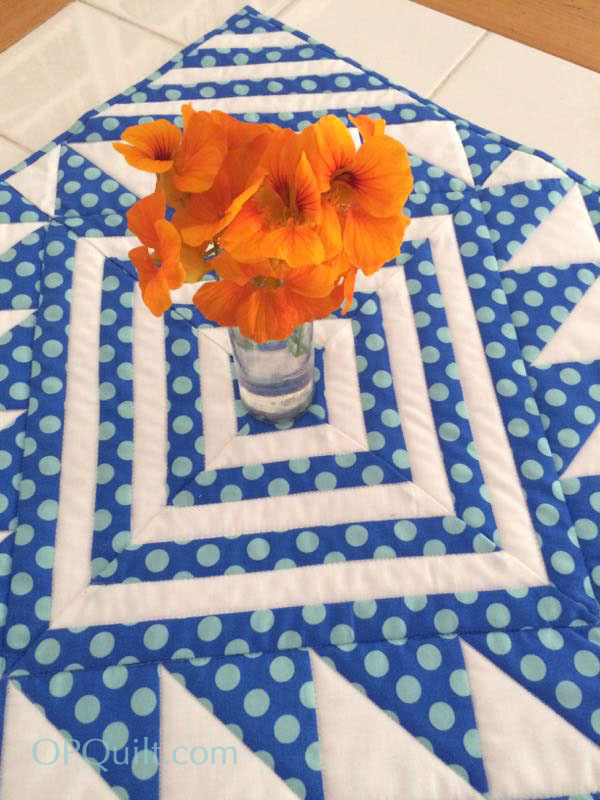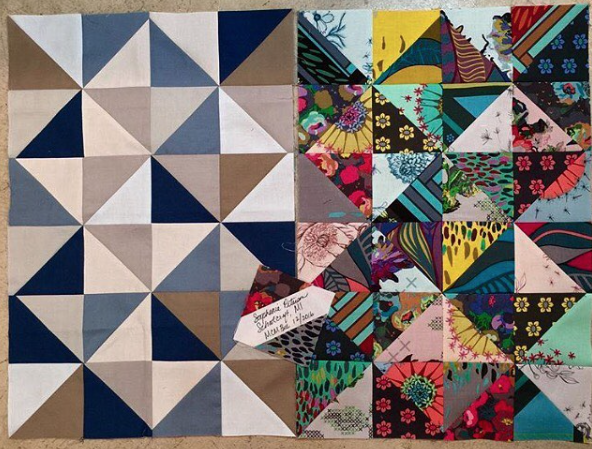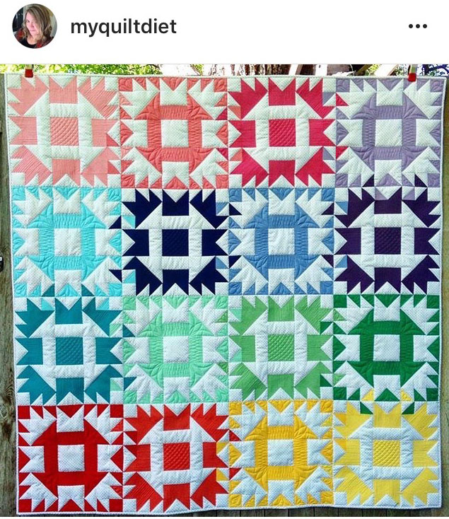 And Stephanie’s window-pane triangles completely change character in the different fabrics. There’s a great lesson for us all to learn–sometimes we don’t have to change our blocks or patterns, but instead think outside the box on our fabrics.