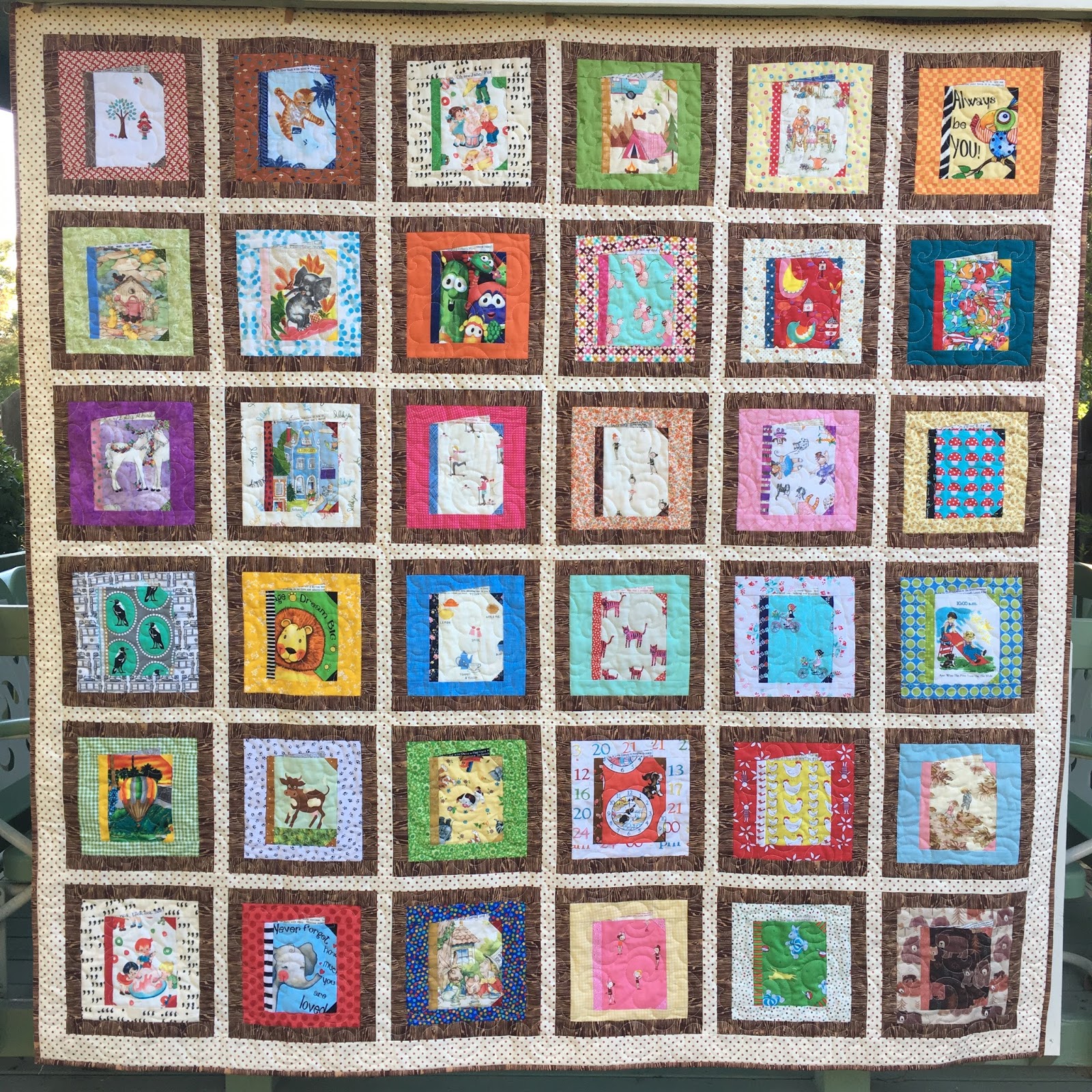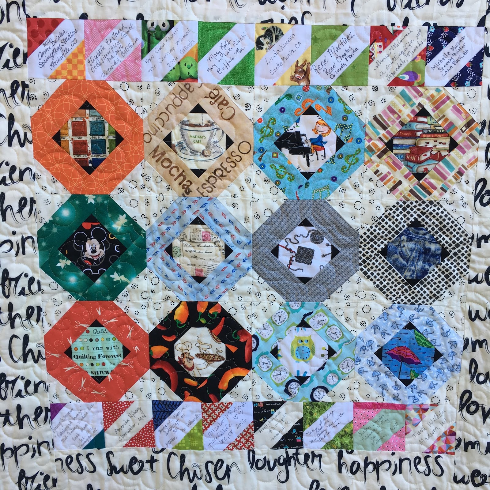 She arranged all our signature blocks on the back with some fussy cut blocks that were representative of her, so her newest grandchild could associate these cute blocks with her grandmother.