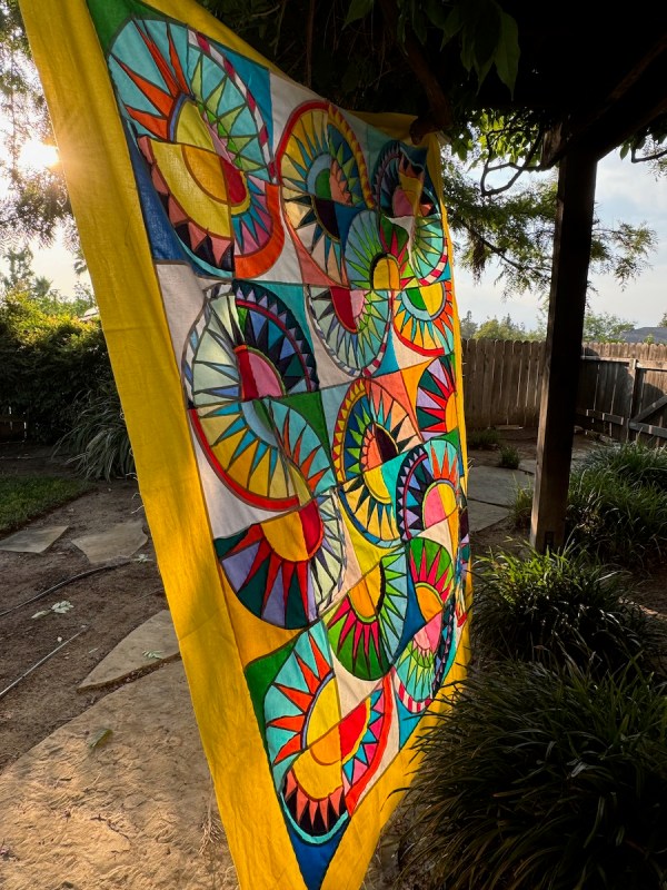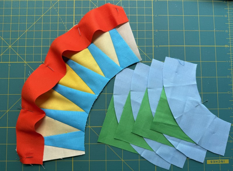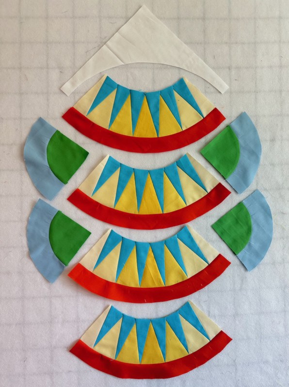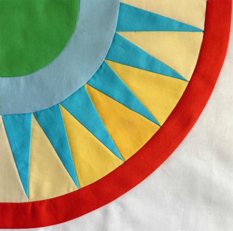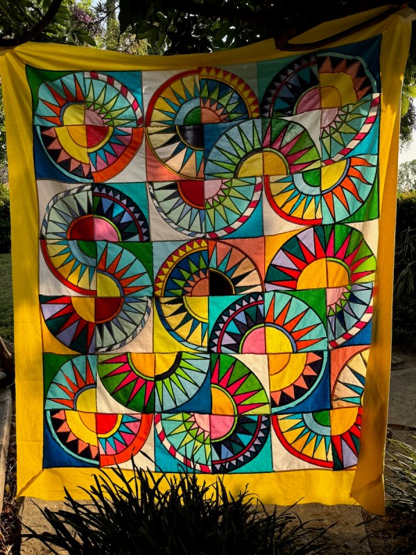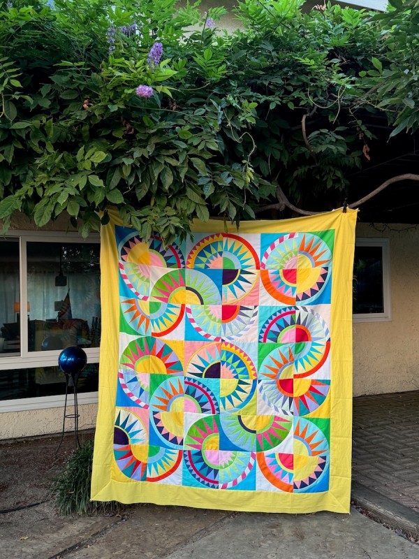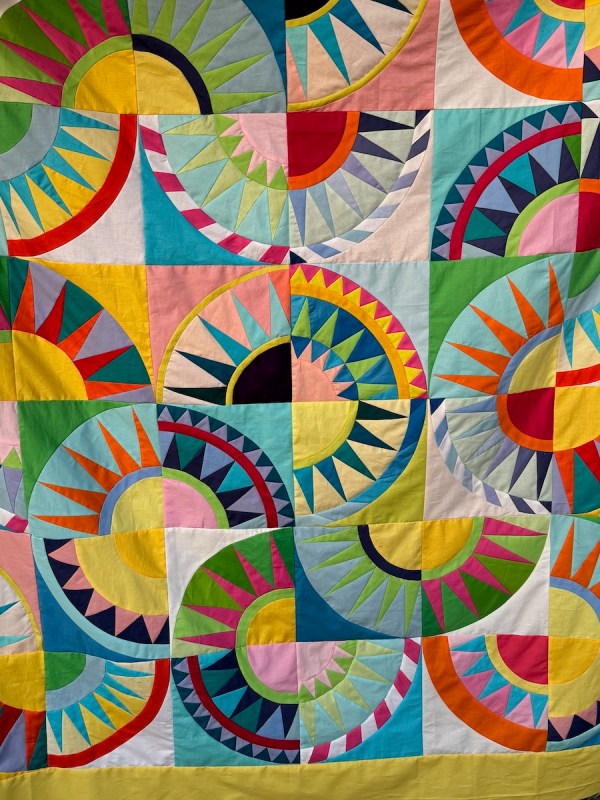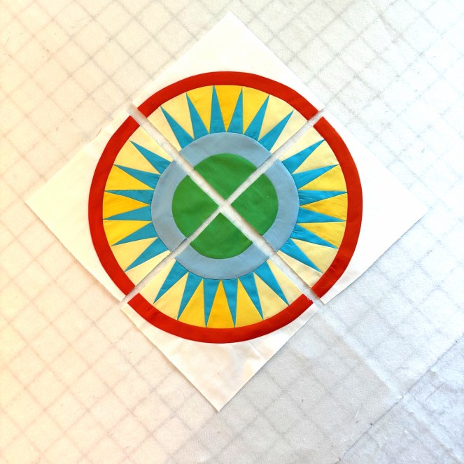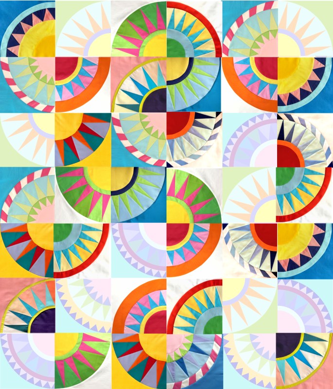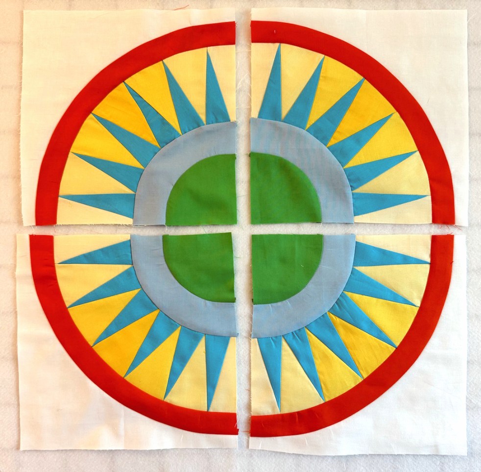 While that took some time, to get all those blocks designed and drafted, then figure out a tutorial, then make the required number — it seemed to take longer to quilt it myself. Every block called for a new idea, a new way to outline the rays, or fill in the backgrounds, or sculpt the arcs. Many times I seriously doubted I was up to the task.
