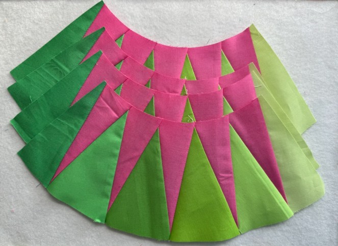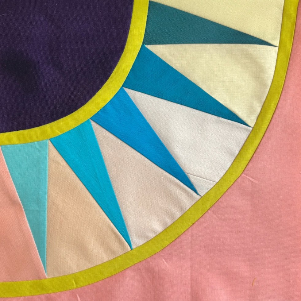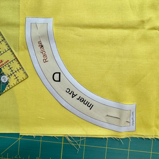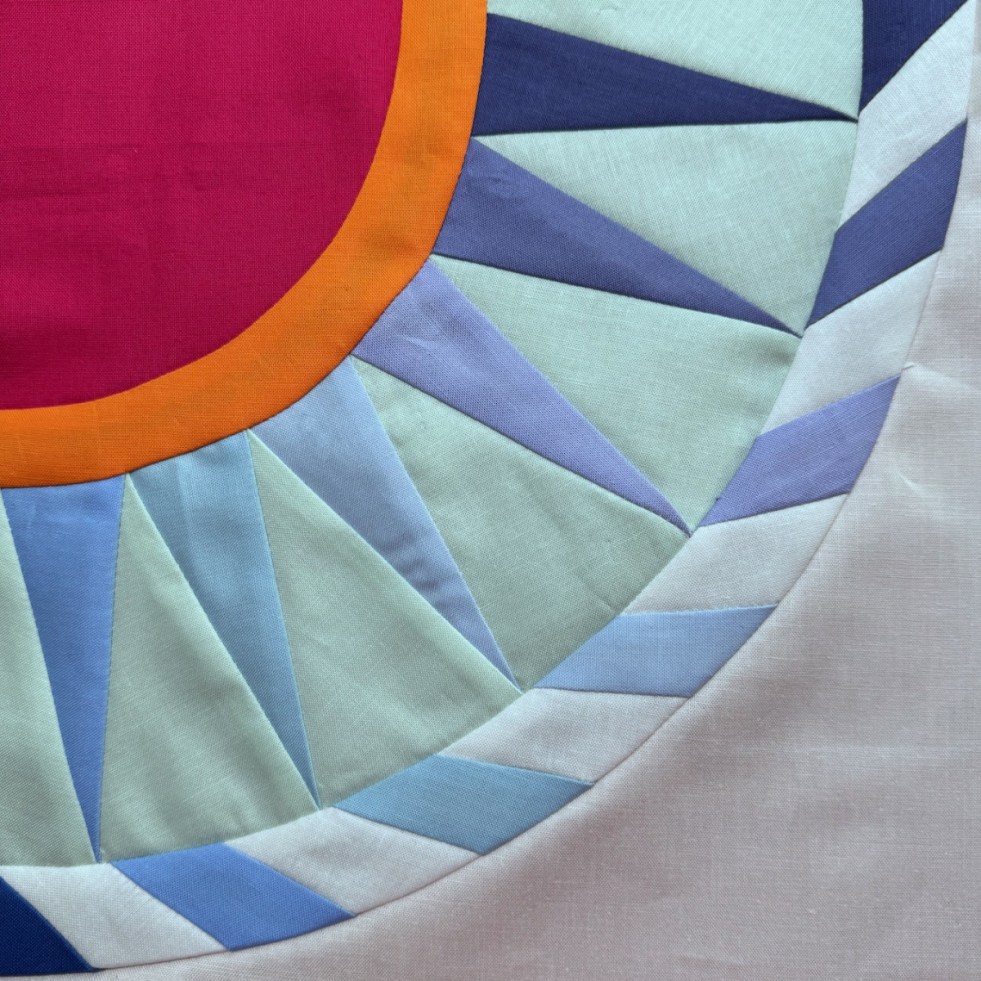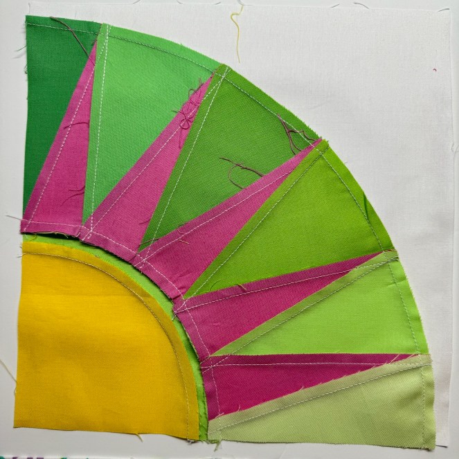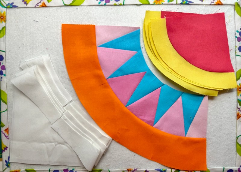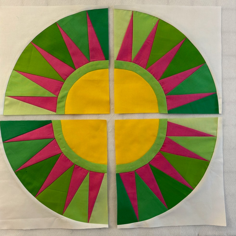 This girl watches over all my Foundation Paper Piecing. I learned in a class from Verushka Zarate (she is coming to Road 2025!) and I made this girl in that class. Underneath her you can see I’ve clipped swatches and numbered them, from 1 to 7, and then I went a little further and cut ray shapes (I only need three of each) and pinned them below. You can pin a length of fabric underneath, if you don’t want to cut a shape of fabric.