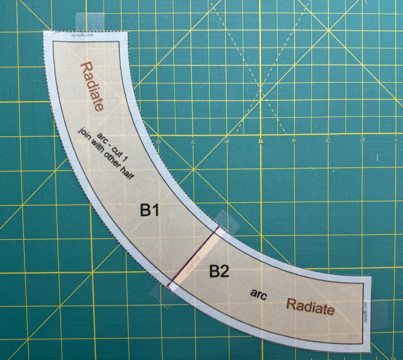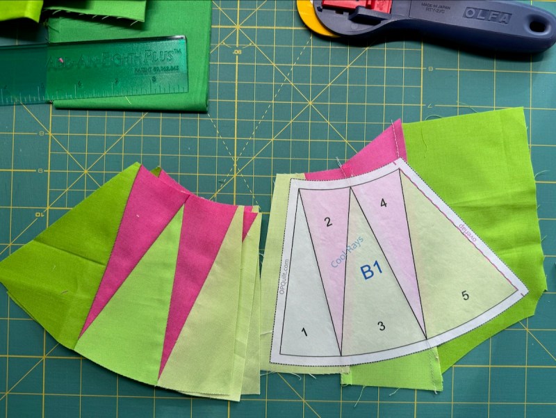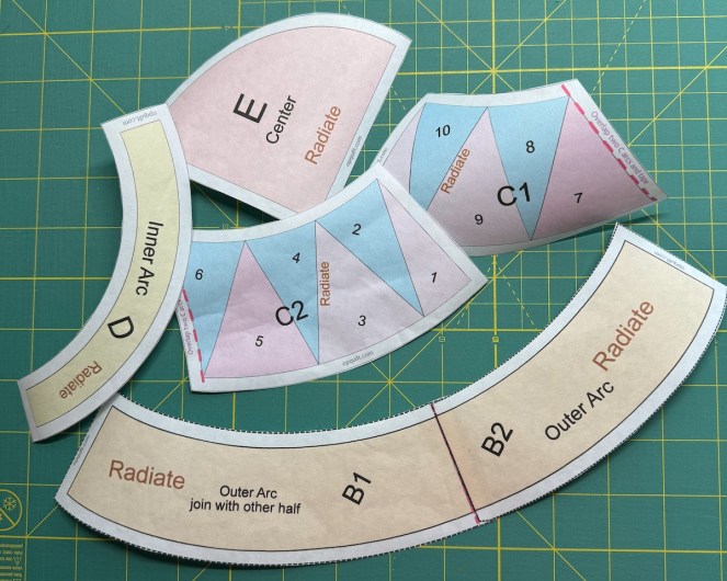 I like to start with building the semi-circles of rays. This post will give you tips and tricks for making this this block (pattern available here). Cut out around the outer black dashed lines, and then figure out your colors. You can see my penciled-in numbers on the rays (C1 and C2 have a soft green background; B1 and B2 have a white background, so no numbering there).