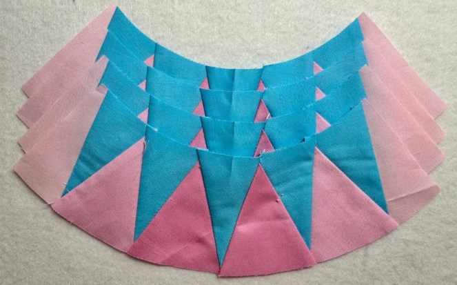 I sewed that, trimmed it, pressed it, and now moving on to Section 9, again making sure that the blue behind is as large as the next section.