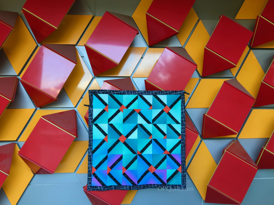My husband found the photography site for us at University of California-Riverside. It’s the artwork on the front of the Genomics Building by Jim Isermann, the sculpture influenced by geometric shapes of molecular structure and its illustration. Yeah, I’m in love with this. And did I mention my husband broke three ribs last week? Yet he still helped me schlep around the quilts (and holding one up for me in another upcoming post), even clamping on one side where I couldn’t reach. (It was a small household altercation with a huge yard waste container; he will be fine in about six weeks, but for now I do the trash.)