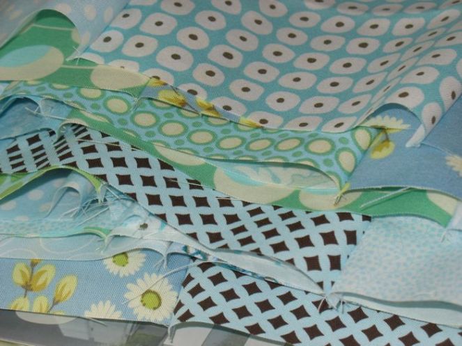 Trying to keep the random effect in my quilt assembly, I laid out all my blue squares, and just sewed them together in strips of 4 squares or six squares, and laid them out on the floor (below).