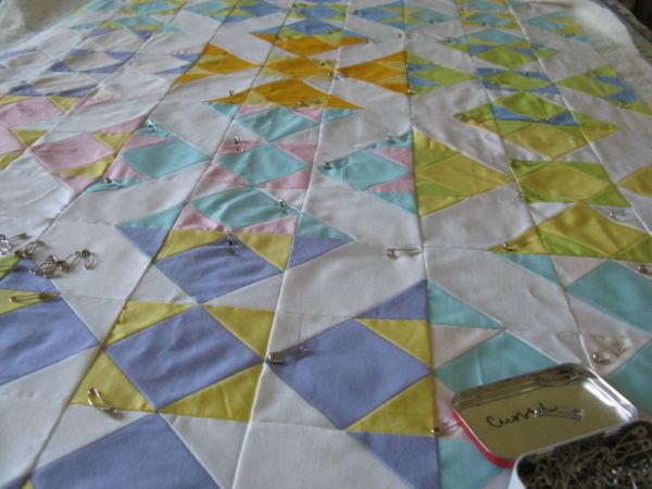 Pinned Summer Treat on the bed while listening to the presidential campaign debate analysis on NPR. Nothing like keeping your mind busy while your hands are busy, too. I plan to work on this quilt, plus a few other things this weekend, when my church has a world-wide conference. They broadcast this conference twice a year, in April and October, and it’s so nice to quilt and listen and refresh that side of me that needs to think Deep Thoughts occasionally.