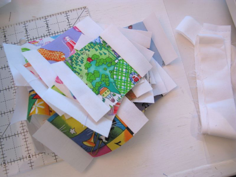 Matching centers and edges, ease the stacked quilt blocks onto the white on-grain strip of white fabric. Repeat until four rows of stacked quilt blocks and three strips of white fabric are sewn together. I sewed the seam with the quilt blocks to the throat plate of my sewing machine, allowing the motion of the feed dogs to help ease in any extra fabric.