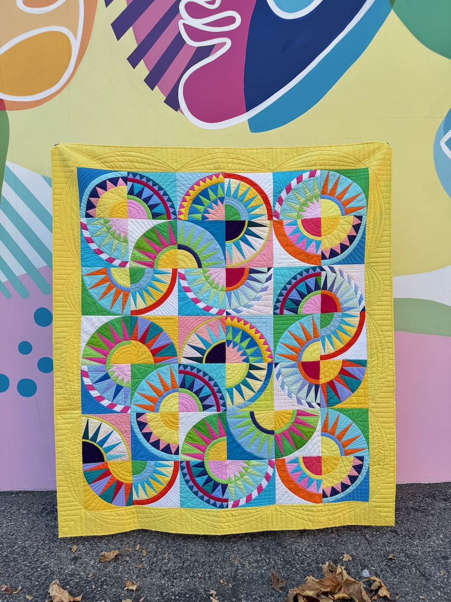 While that took some time, to get all those blocks designed and drafted, then figure out a tutorial, then make the required number — it seemed to take longer to quilt it myself. Every block called for a new idea, a new way to outline the rays, or fill in the backgrounds, or sculpt the arcs. Many times I seriously doubted I was up to the task.