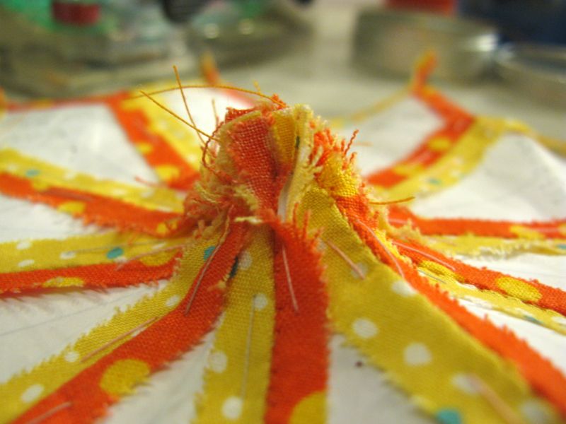 Mary finishing up her Christmas Tree skirt, using the trick of a glue stick to hold the binding in place for top-stitching.