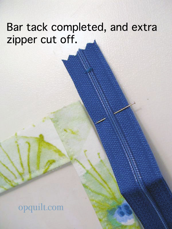 At the outer pin, you’ll be doing a bar tack, which is only a zig-zag stitch done in place. Set your sewing machine for a wide zig-zag (so it will clear the zipper teeth), your stitch length to zero, and sew the bar tack in place. Then about 1/2″ away from that towards the zipper stop, trim off the zipper tape. If you are using a plastic zipper, you can cut right through it. If you are using a metal zipper, snip the tape to the teeth, then kind of wiggle off the excess zipper tape.