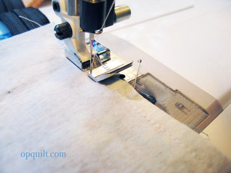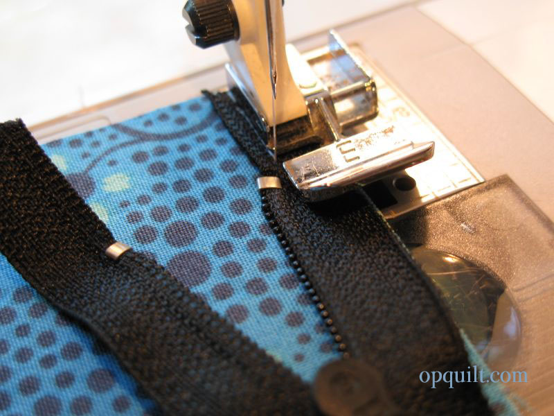 Slide the zipper pull tab down a couple of inches, and start stitching. When you get close to the zipper pull tab, keep the needle in your fabric, and ease the pull tab past your needle, closing the zipper. Continue stitching. Remember to STOP stitching 1/2″ in from the other edge.
