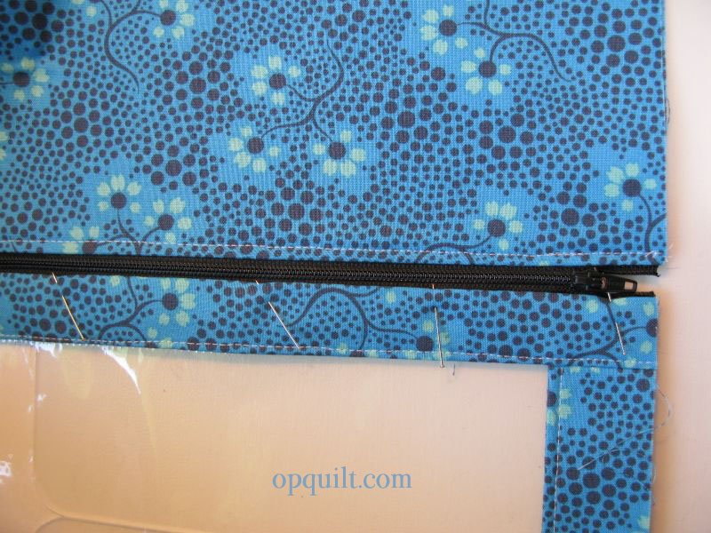 The other side is easier because you only have don’t have a lining to deal with. The zipper is now flat, intalled on the back. Working on a flat surface, line up the back with the front, aligning the side raw edges, as shown. Place a few pins anchoring the zipper tape to the front upper edge of the front vinyl window.