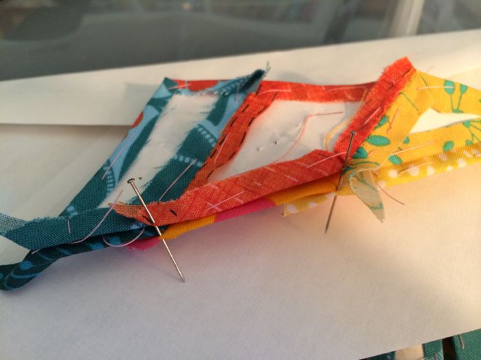 Then fold the long raw edge in and fold the binding over the raw seam allowances. Pin, as shown above, and below.