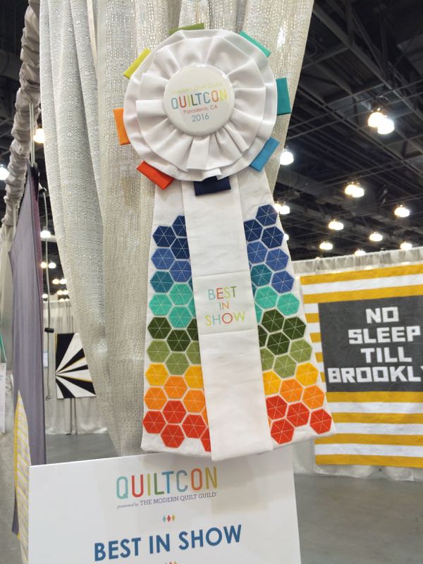 In Venue 11 (Espace Commercial) there was enough room to do several exhibits. This quilt is from Quilt en rêve, “an association of British, Dutch and American antique quilt enthusiasts. Some of them have been quilting for over 30 years, always conscious of working in a traditional way, paying attention to detail, the choice of fabric and hand sewing” (from here). (UPDATE: I heard from one of the members, Gabrielle Paquin, and she wrote that currently “the team is essentially French and we have an Hollander lady with us.”)
