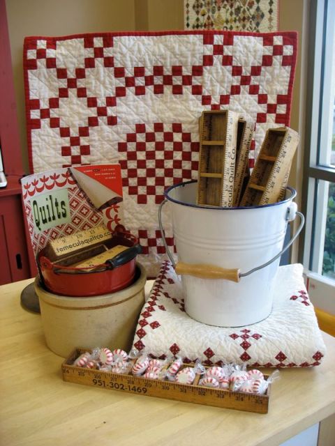 ‘We had picked three pieces of remnant blue and was just fingerin’ some red calico. We was jest palnnin’ on enough for the middle squares from that.