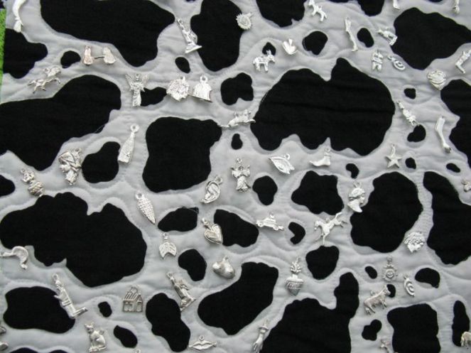 I call these two quilts “tablecloth” quilts as they are basically old lacy linens laid over a backing fabric, then quilted. They are both by Cindy Needham of Chico, California; this one’s titled The Nuns Quilt as the linen was handmade by nuns in the 1900s. This was hand-quilted and beaded.