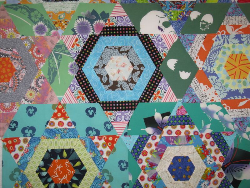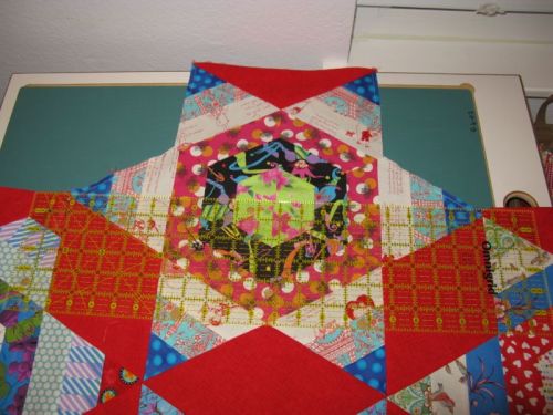 My quilter, Cathy of CJ Designs, did a meander over the star points and a star on a rolling wavy line in the borders. I had wanted to quilt this myself and imagined some glorious feat like Angela Walters accomplishes–all detail and punch and wonderfulness. But in the end, I traded “Done” for “Glory,” as the pragmatic side of me realized that summer was o-v-e-r and if this quilt was to be enjoyed, I needed help on the quilting.
