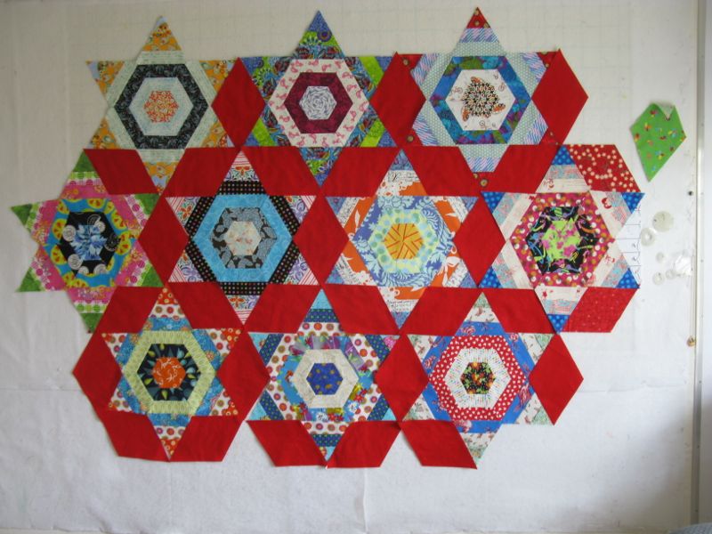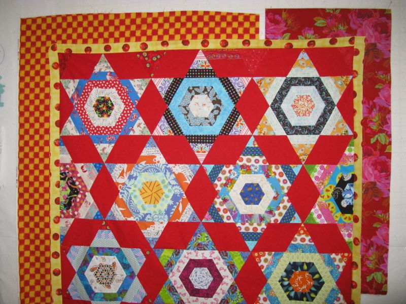 I can finally write this post, as I caught Dave before he picked up his latest Donna Leon book (see the picture at the end for my stack). I used to have this perfect photography studio, but then we had to replace our garage doors and I can’t staple a white sheet onto it any more. So, I have Dave hold up the quilt for me in the back yard.