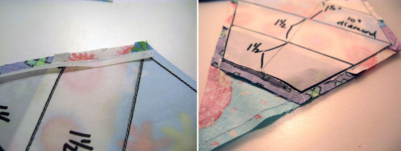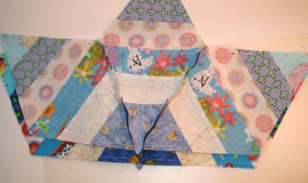 Why does it not matter that much to me? Because I like to cover my design wall with Thermolam, a type of fleece. They have renamed it, so look for this number — TP970 — on the bolt. (Here’s a post on how I did my old design wall.) I had thrown my old Thermolam/Quilters Fleece/Whatever in the dryer to fluff all the threads off from previous use; it works fine. I smoothed it out over the flannel, using straight pins to keep it on, and letting it overlap by 1/2″ at the seam (which you can see in the photo below). It really grabs the blocks and pieces much better than the flannel by itself, and is easily cleaned by running a sticky lint roller over the surface.