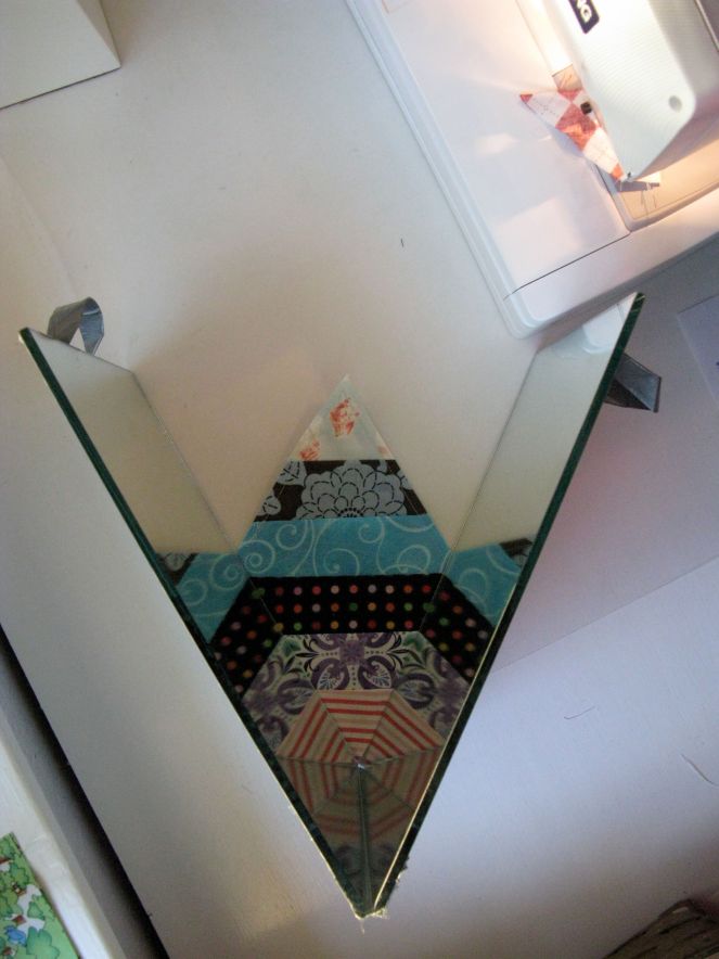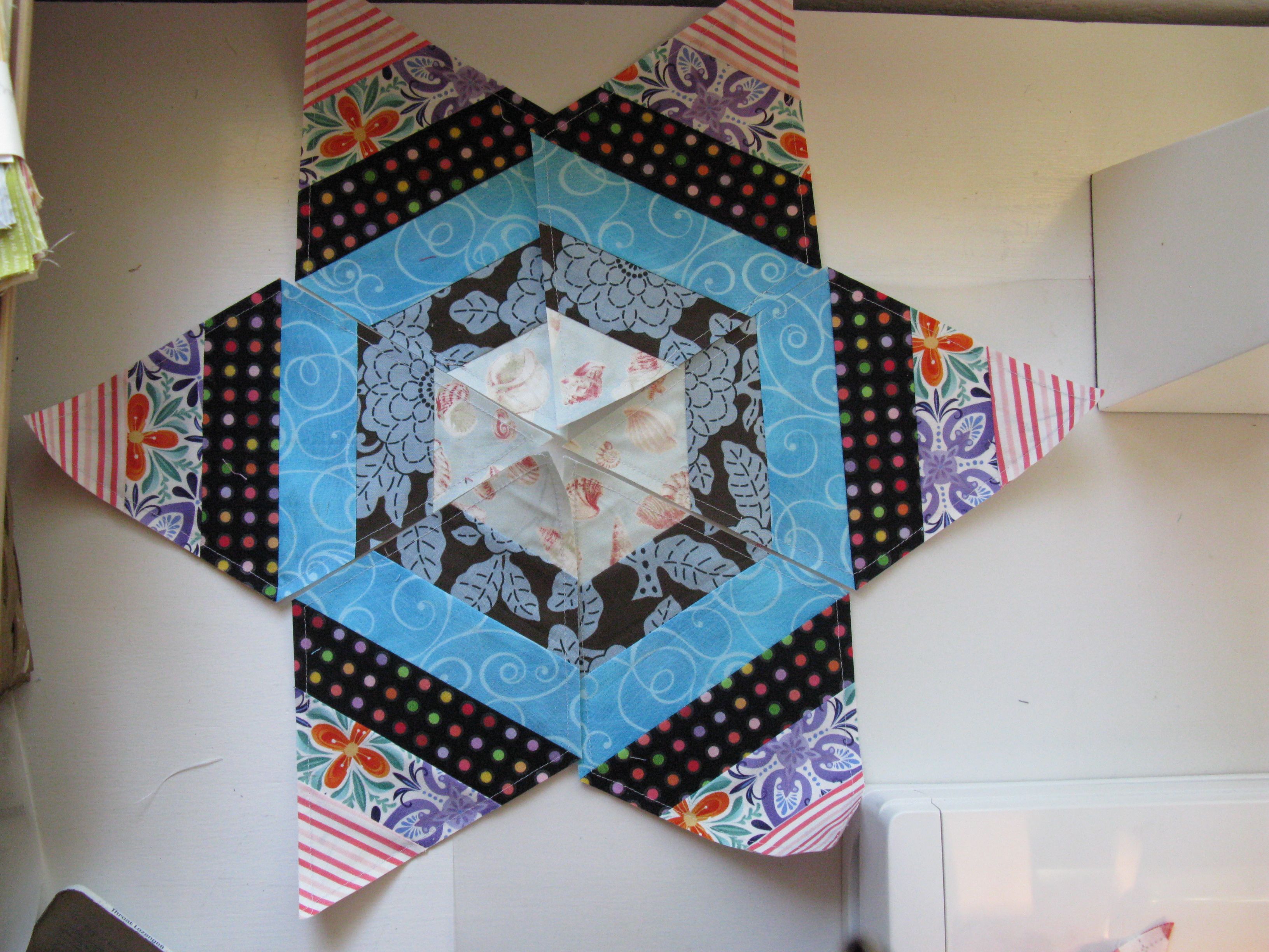 I cut out around the electrical outlet and pinned that into place, too. Immediately I put up the blocks I’d received from The Gridsters, who jumped into #sawtoothmania feet first. I have only one I’m waiting on, but will start playing with them once I get the last one. Their signature blocks used my Tiny Envelope pattern, found free on this blog.