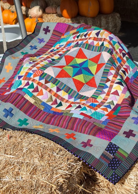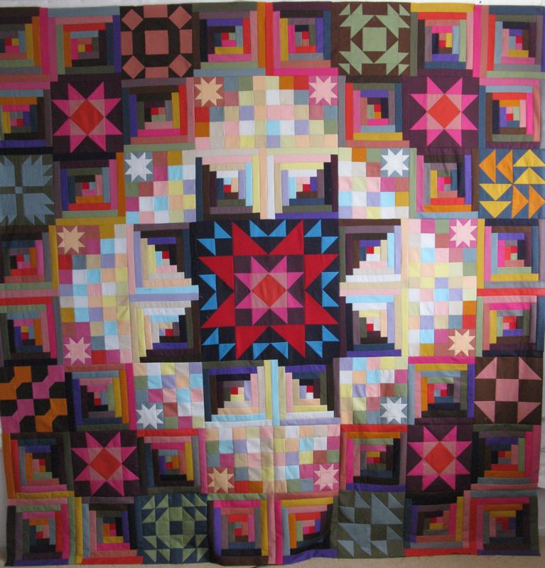 But let me leave you with this gorgeous quilt from Cindy, of Live A Colorful Life, who is a one of those quilters who, while understanding the idea of the “deliberate incomplete,” also has a LOT of deliberate completes, such as her Marcelle Medallion, from *here.*  She and I have often talked often about the WIPs that float in our closets and cupboards, yet I’d like to morph Lewis’ idea of the “deliberate incomplete,” to a new place–perhaps that of a quilt that is not ready to be finished whether because the quilt maker’s “other” life gets in the way, or that the quilter has “lost her mojo” (a phrase often seen on blogs) or does not yet have mastery of the skills needed to finish up (and certainly, that may include time management!).  Yet mine and yours and Cindy’s quilts that are on our beds, our walls and folded ready for visits from family and friends, certainly is a testament that we do finish, that we are — at some level — on our way to mastery.