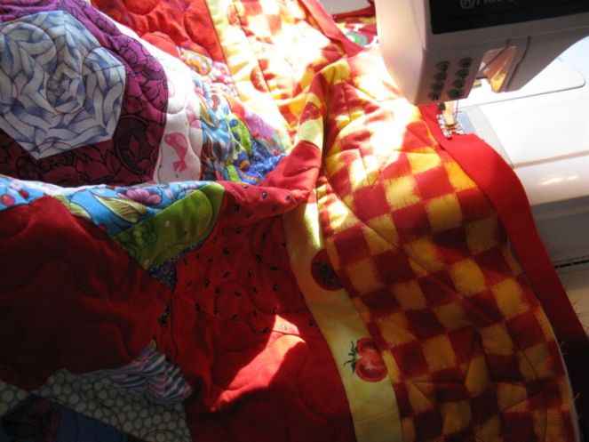 Now ready, set, sew by propping up your sewing machine on door stoppers as the angle of your machine makes you less tired. I learned this at a quilt show, which is why it’s always a good idea to take classes once in a while. You can’t learn everything on the internet.