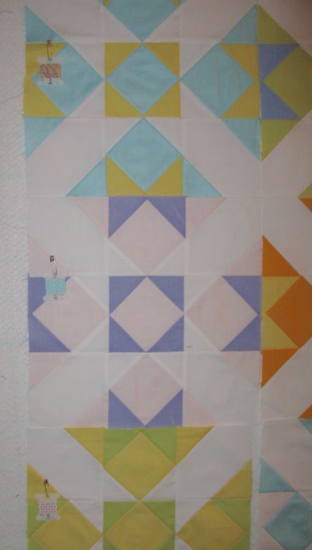This is how I pressed my seams (seen from the back). I like to be able to nestle the seams together by feel, so one has to go one way, and one has to go the other. Now pin the rows together, then flip over the block and check them.