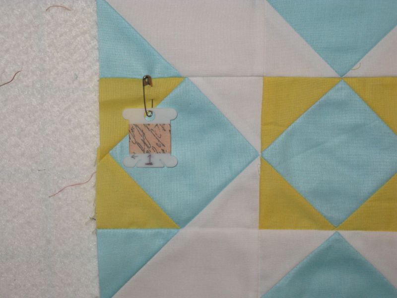 First corner is on, so lay out the next set of stitching. I put the yellow square opposite on one of my squares, to remind me that only one has all four corners that are yellow.