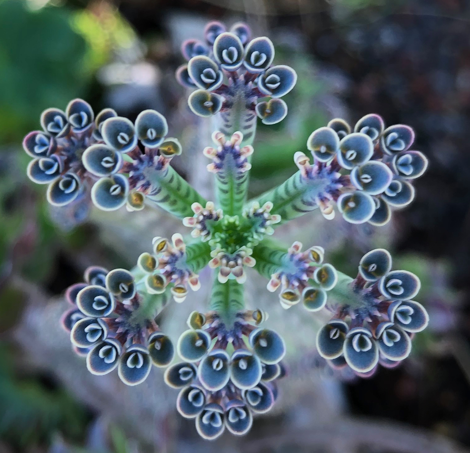 My husband is a photographer who specializes in small landscapes: detailed shots of flowers that he finds around our neighborhood. Since we live in a climate that is temperate, we have plants from Brazil, Australia, New Zealand, and even Madagascar, and he finds and captures them all in their exquisite tiny details. The plant above is called Mother of Millions.