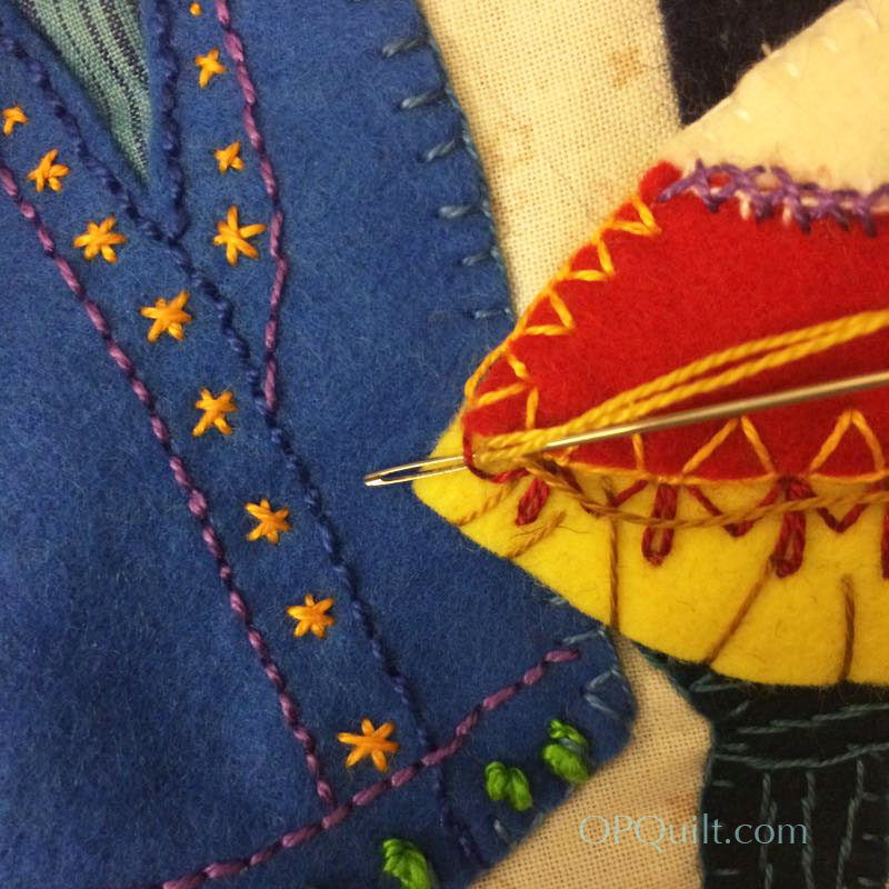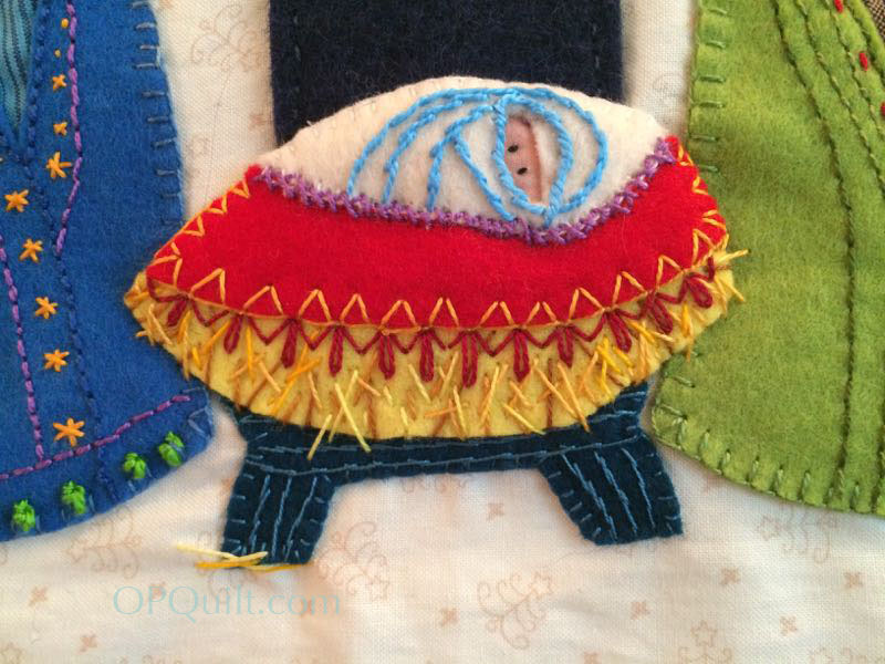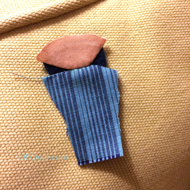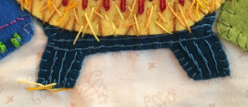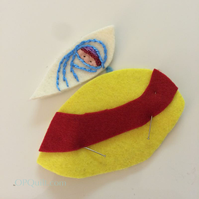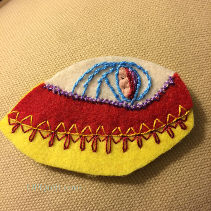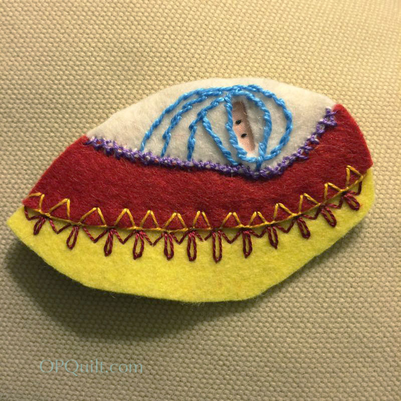 Cut a 1 -1/2″ circle of yellow felt, and a 1 -1/4″ circle of light orange felt. Embroider them as shown (omitting the outside small yellow stitches–that’s added when you tack it onto your background).
