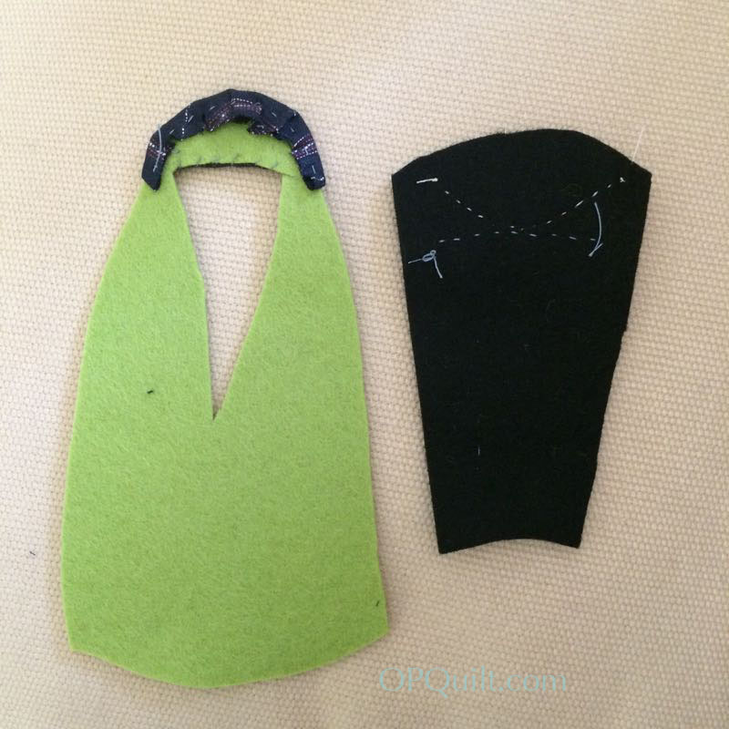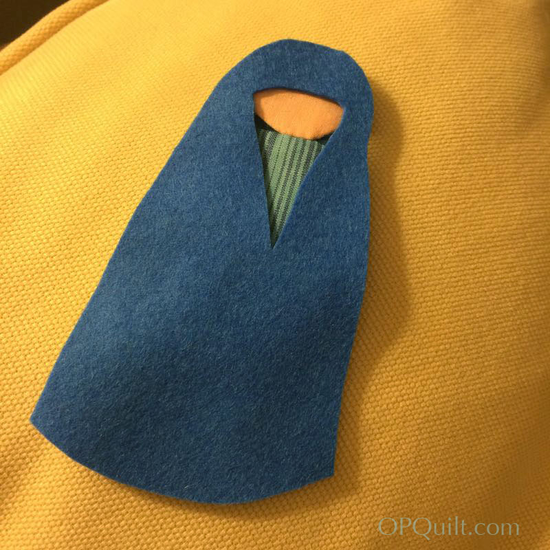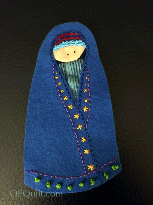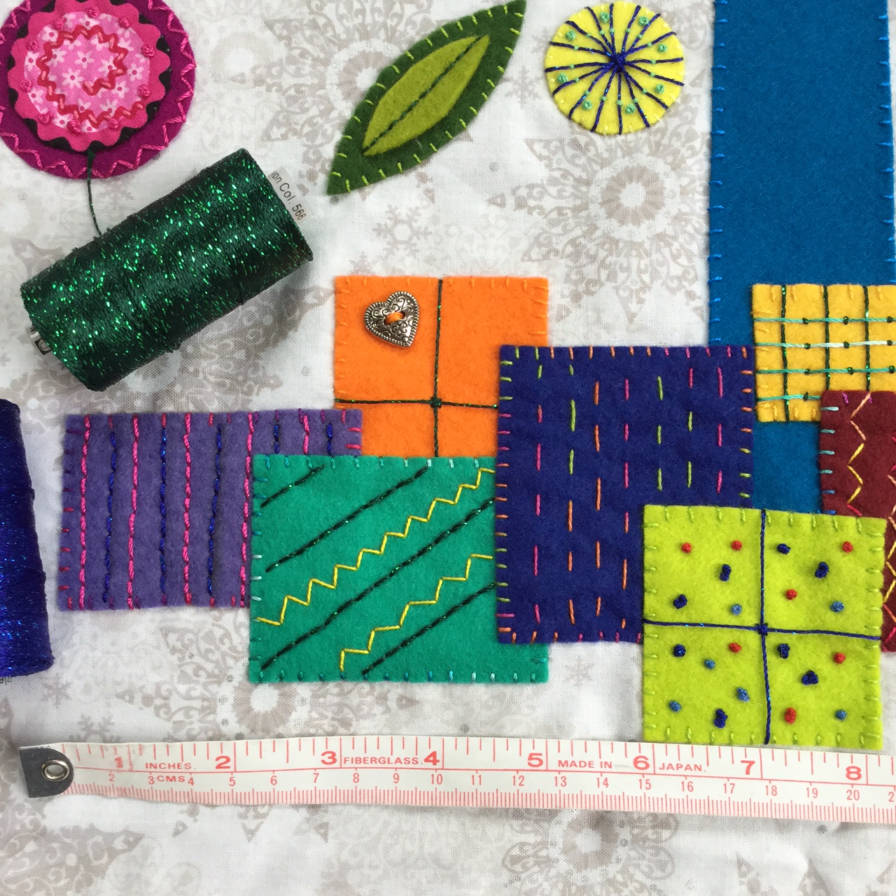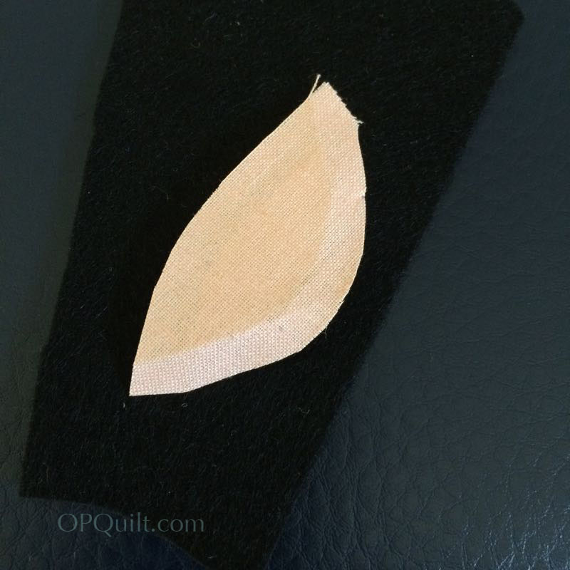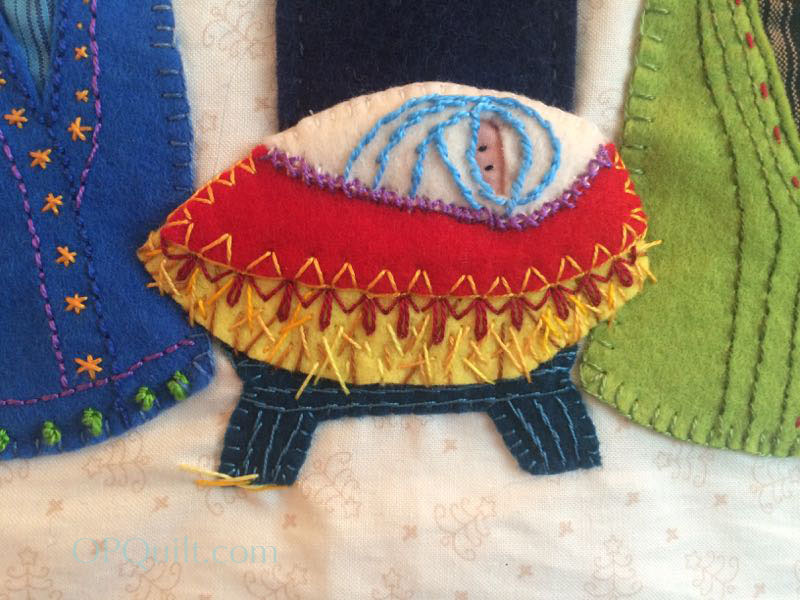 Cut a 1 -1/2″ circle of yellow felt, and a 1 -1/4″ circle of light orange felt. Embroider them as shown (omitting the outside small yellow stitches–that’s added when you tack it onto your background).