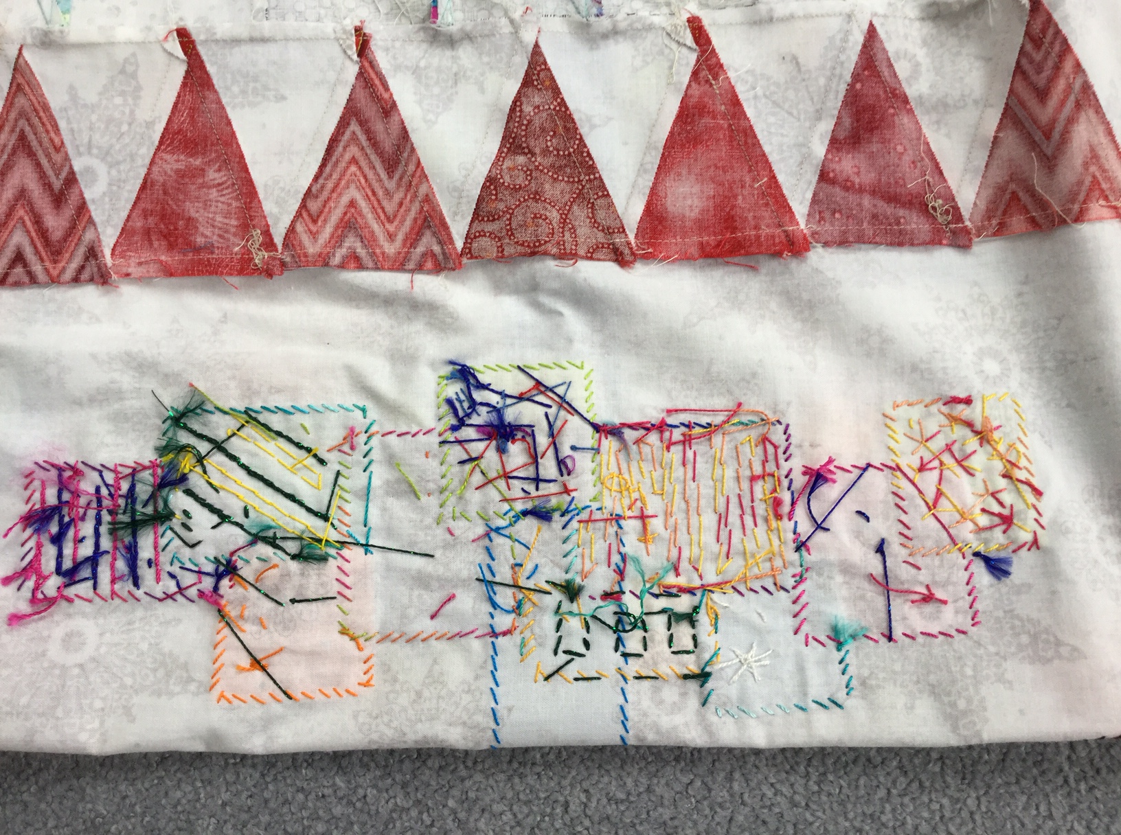 Press the seams to one side, and stitch that row of Border #2 (wonky star) on to your Border #1 (red triangles). Repeat with the bottom row of star blocks. Press seam toward the red triangles border. Your quilt should now look like this.